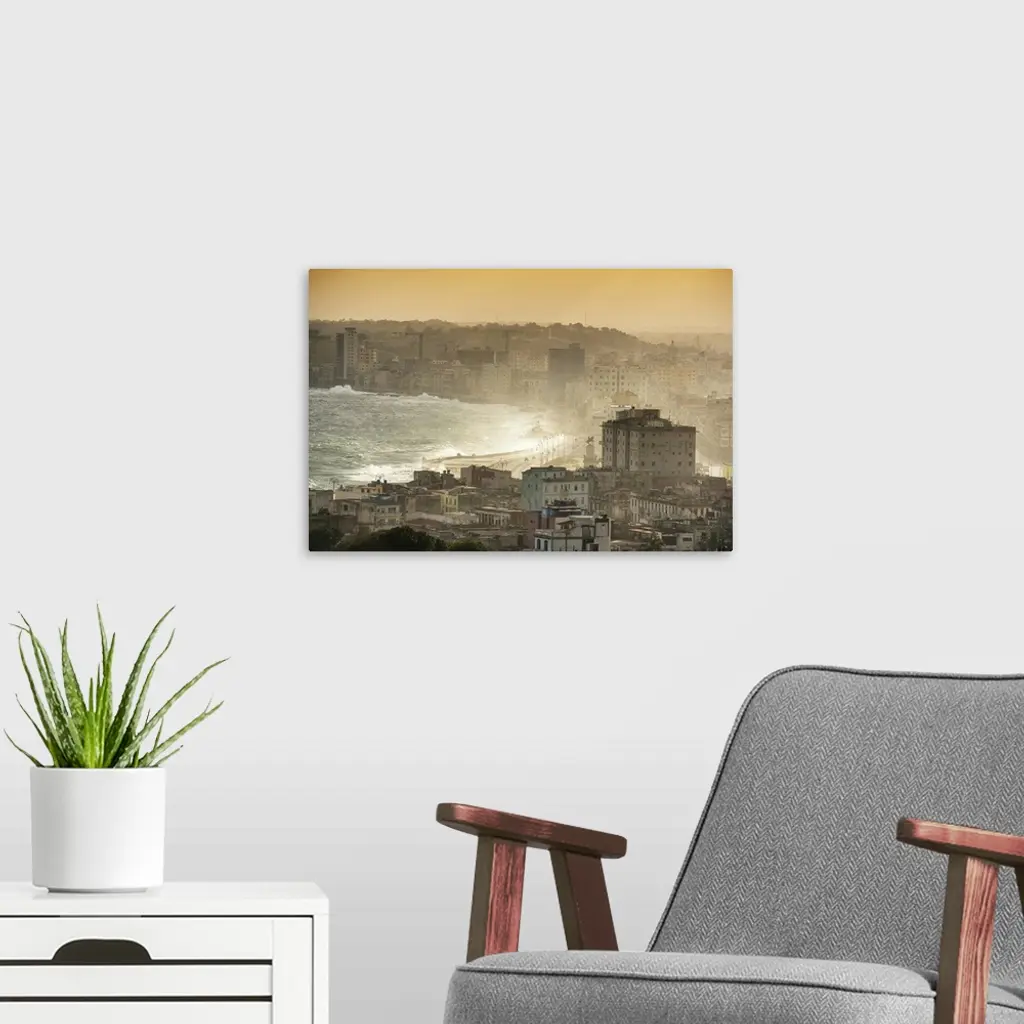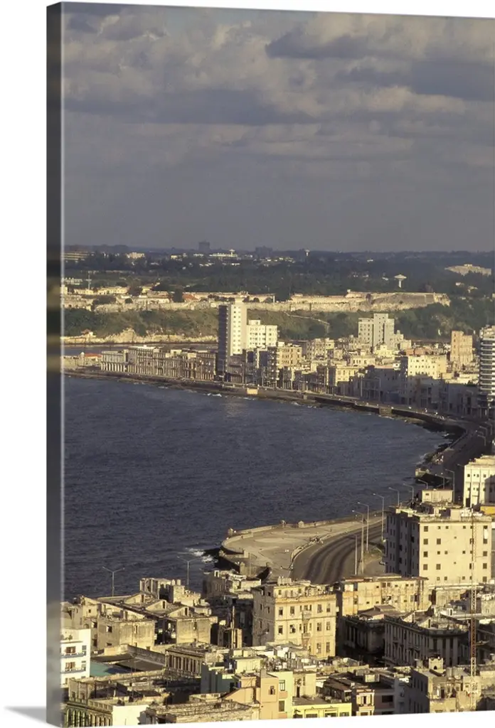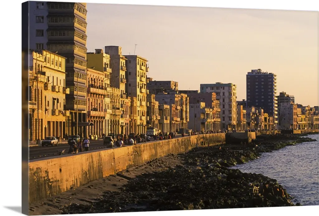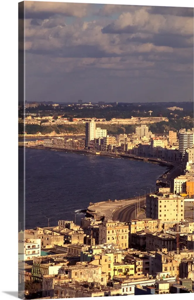 Aerial photograph of the ocean meeting the city of Havana at sunrise.