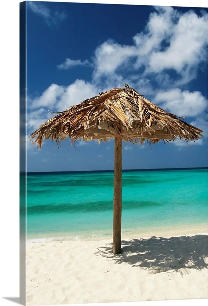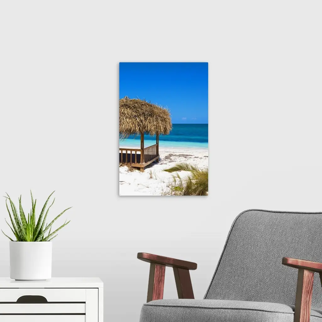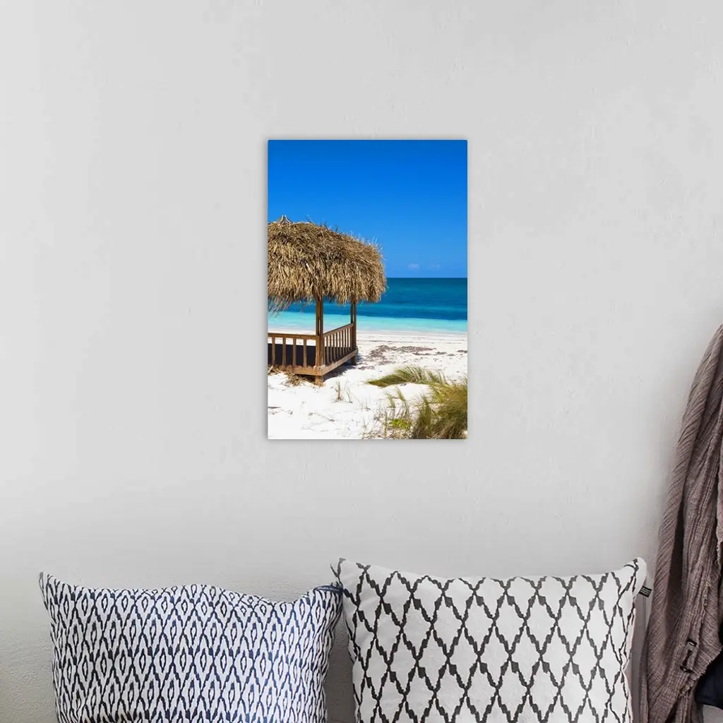 Relaxing photograph of a cabana on the white sands of a Cuban beach with beautiful blue water in the background.