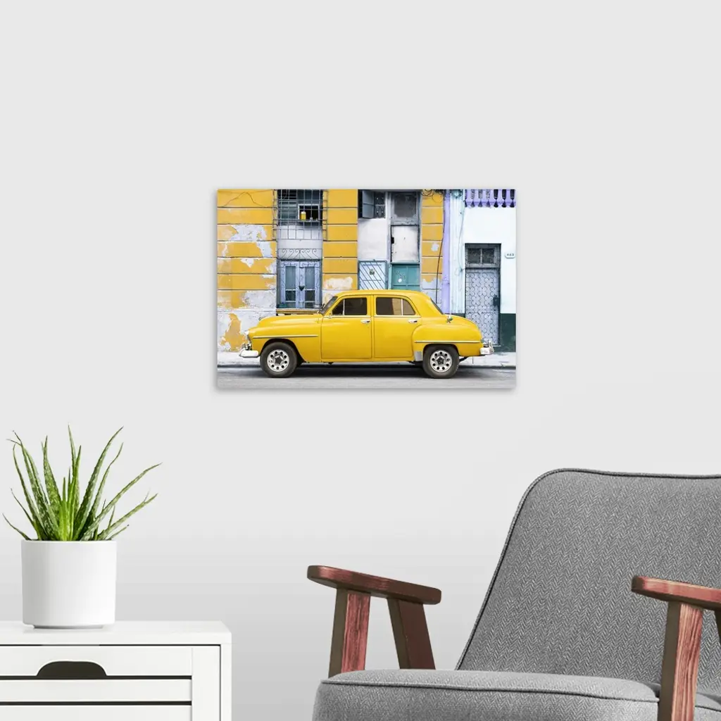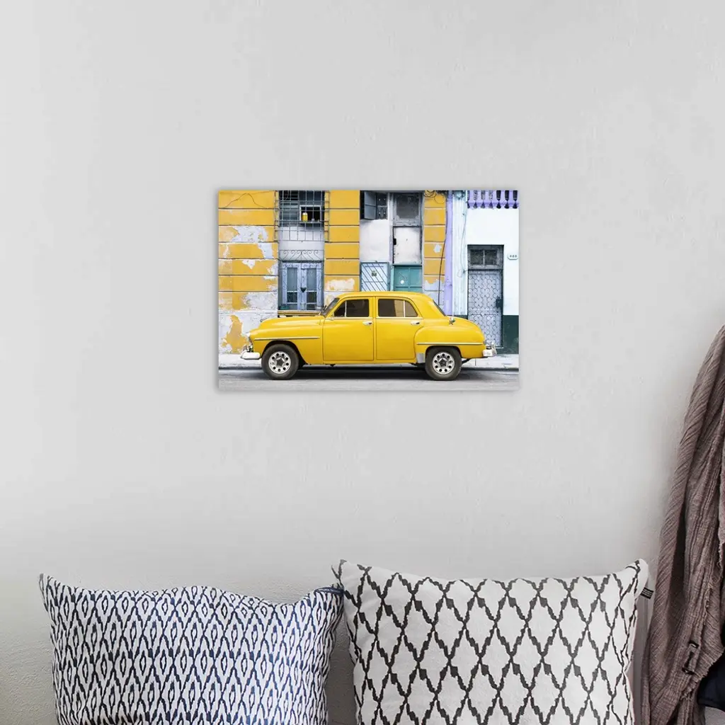 Photograph of a yellow vintage car parked on the side of a street with an old building in the background.