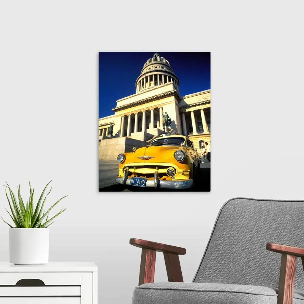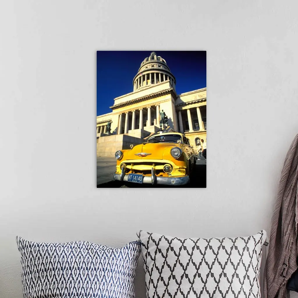 Cuba, Havana, Vintage car in front of Capitolio Nacional wall art for home and office decor. Discover canvas art prints, photos, mural, big canvas art and framed wall art in GreatBigCanvas.com's varied collections.