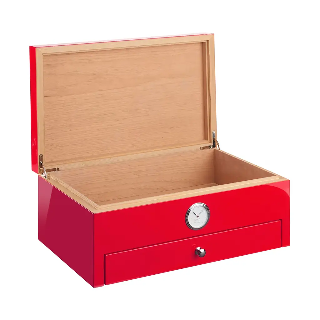 Meticulously crafted from varnished wood with an ultra-glossy finish in red, this humidor pays homage to Cuba's vibrant heritage with its iconic flag printed glass design. The aromatic cedar interior maintains ideal humidity for prized cigars. A cedar-lined drawer with Alcantara insert stores extras, while a separate compartment holds up to four 60g Boveda packs. Removable cedar dividers organize by size, and the analog hygrometer monitors humidity. Capable of housing up to 100 cigars.