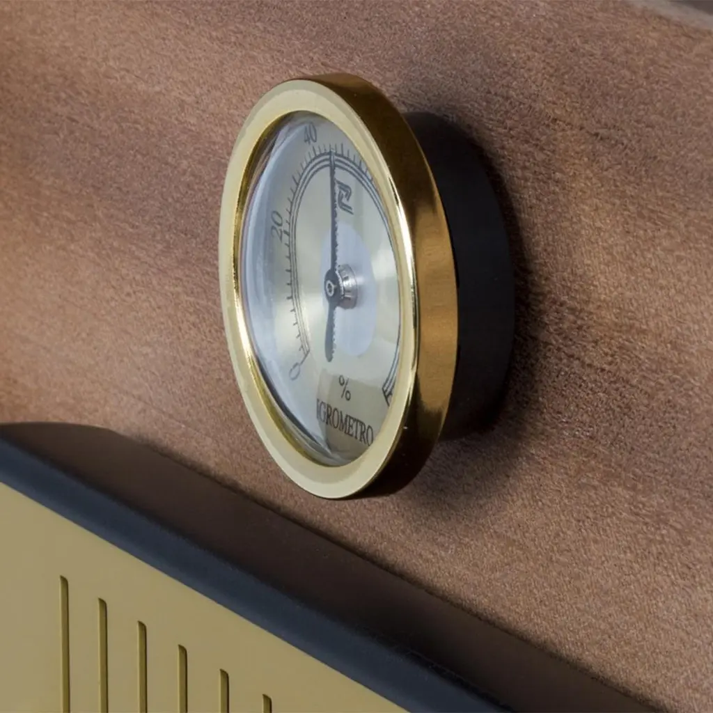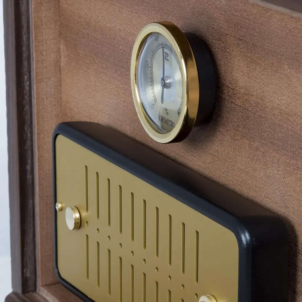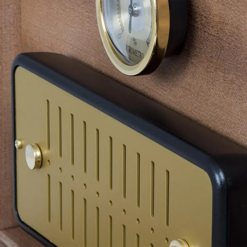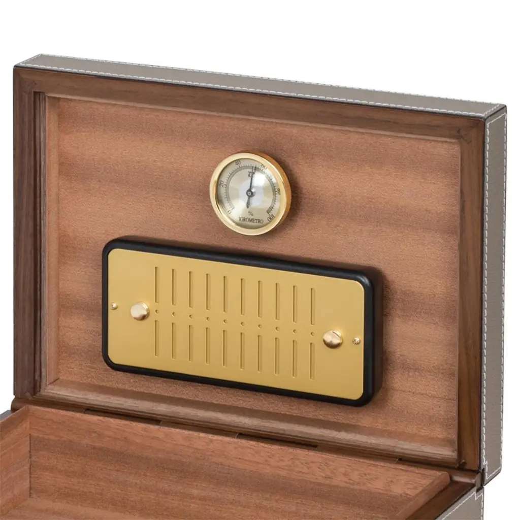 Humidor Cubano Grey with inside lining in cedar woodin light brown finish, inside box with a hygrometer and a humidifier. Main structure in walnut wood covered with high quality grained leather in grey color.