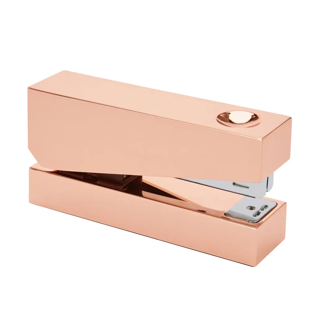 Cube stapler is made of zinc alloy, plated with copper and lacquered to finish. Subtle indentations on the side allow a firm grip. Team with our Cube Tape Dispenser, desk tidy and pen, available as a set and presented in gift-worthy packaging.