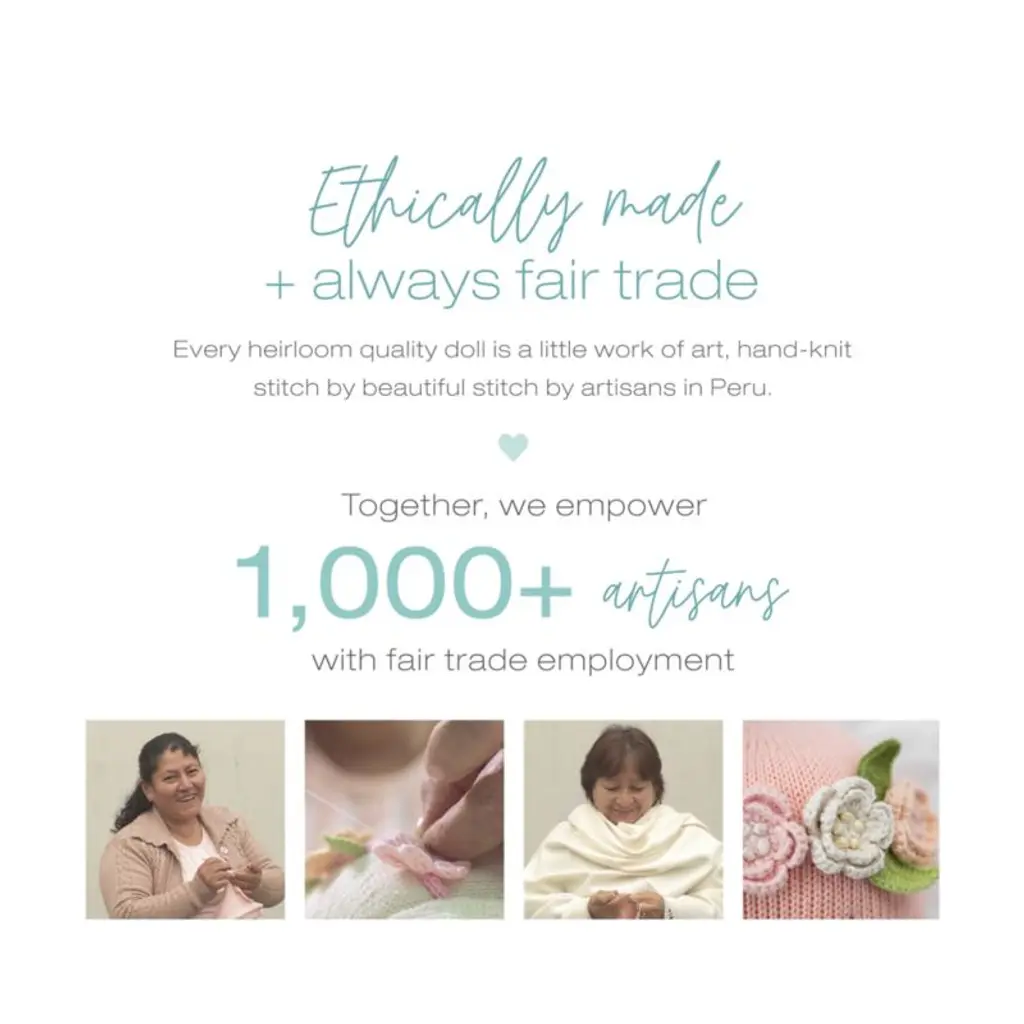 Meet Cuddle+Kind's Hannah bunny doll, a cherished companion that will warm your child's heart. This heirloom-quality doll is entirely hand-knit using premium 100% cotton yarn and filled with a hypoallergenic polyfill, providing the perfect cuddle weight. From Hannah's delicate crocheted flower crown to her fluffy cottontail, the doll is meticulously crafted by talented artisans in Peru and Nepal who share a strong cultural heritage around knitting. Cuddle+Kind embraces fair trade practices, and best of all: Each doll provides 10 meals to children in need around the world, including the United States and Canada.