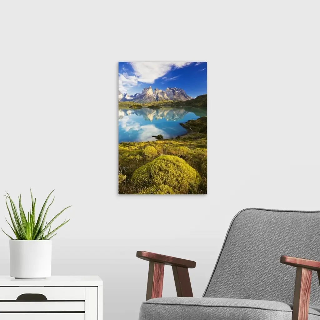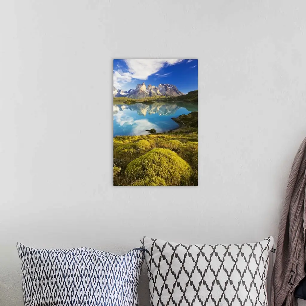 Cuernos del Paine reflected in Lago Pehoe in Torres del Paine National Park, Magallenes, Patagonia, Chile