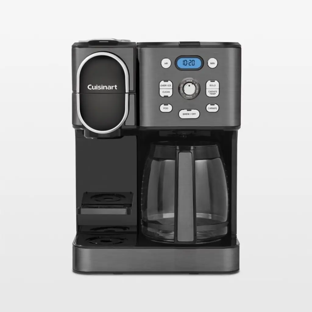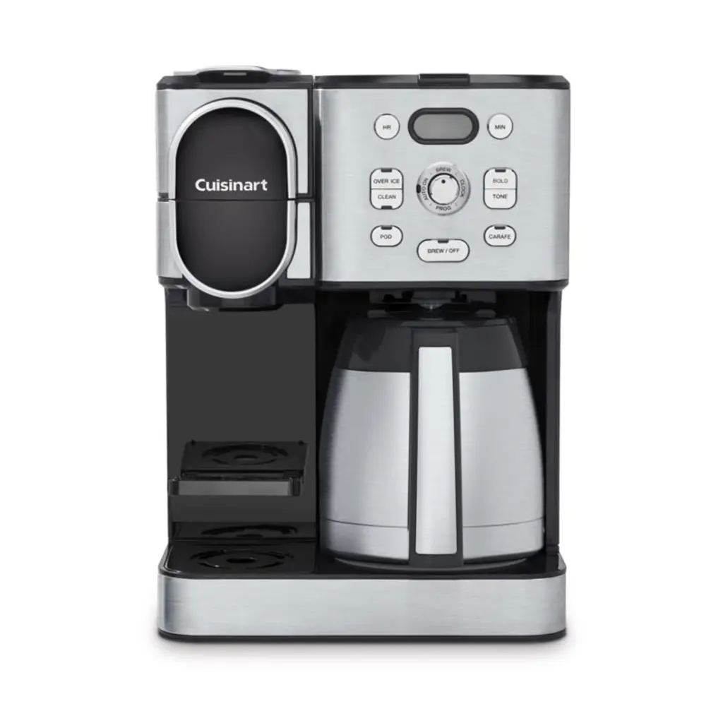 Whether sipping solo or serving a crowd, you'll always get a perfect cup of hot or iced coffee with this dual-purpose coffee maker in sleek stainless steel. Doing the job of two machines while freeing up valuable counter space, this combination brewer combines a single-serve coffee maker with a fully automatic 10-cup coffeemaker. The K-Cup compatible station brews five serving sizes, while the carafe brewer prepares up to 10 cups of coffee with brew strength control and adjustable temperature. A thermal carafe keeps coffee hot for up to four hours. For the perfect iced coffee, the Over Ice function automatically adjusts the brew process for optimal flavor.Cuisinart has been creating inventive and accessible kitchen appliances, cookware and accessories for over 50 years.