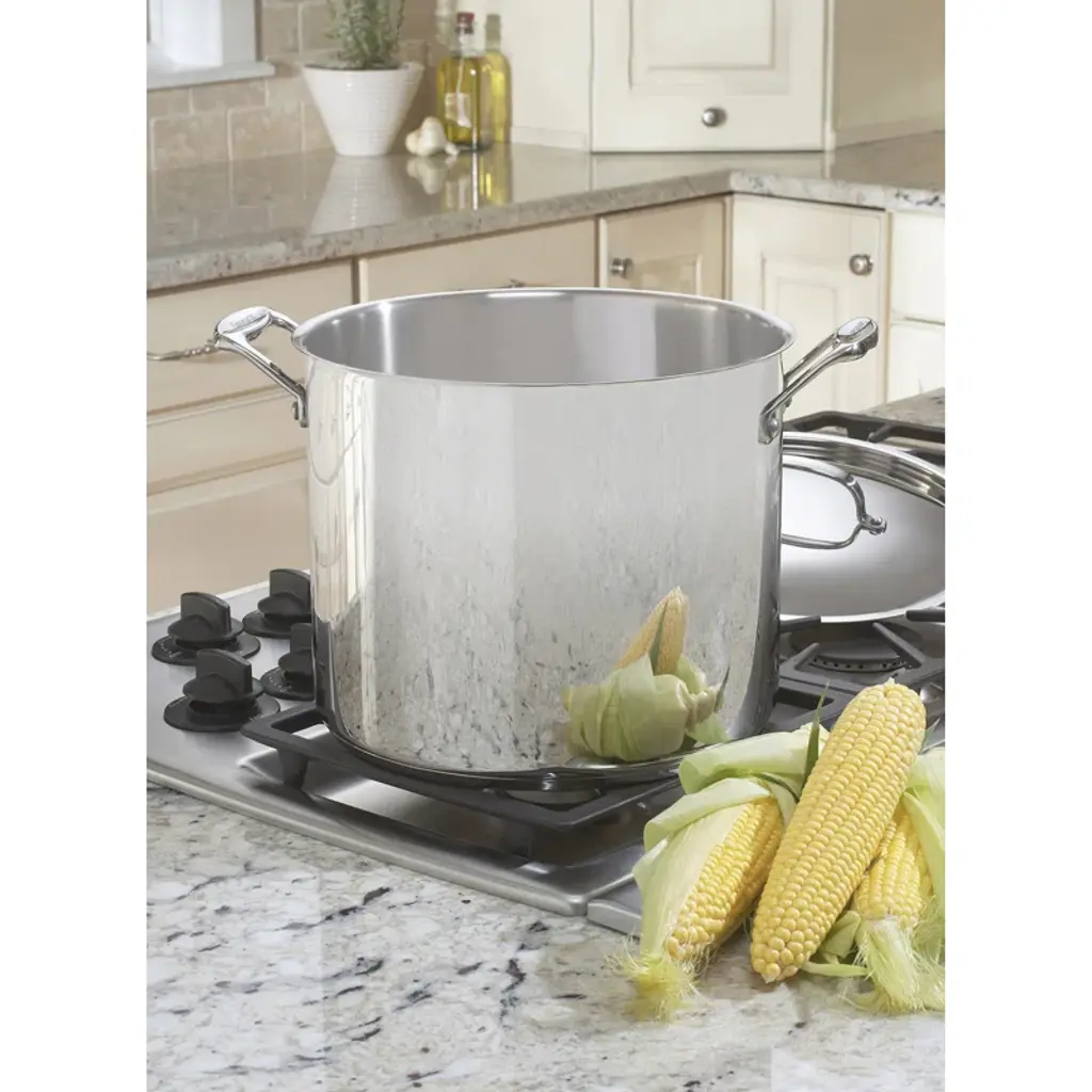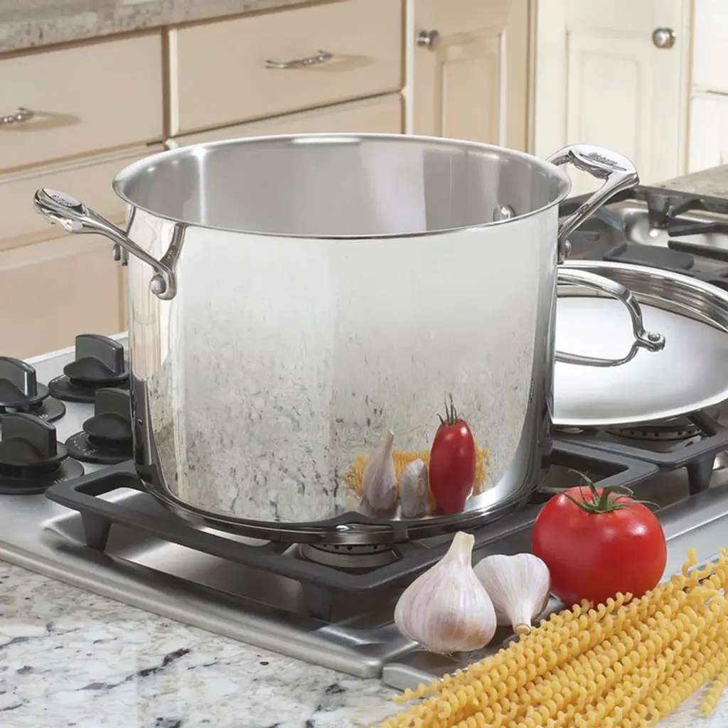 The soup pot is perfect for hearty soups and stews or one-dish meals. On the stovetop, the aluminum encapsulated base maintains even heat distribution, eliminating hot spots. The riveted, comfort-grip stainless steel side handles make placing large casseroles into the oven and lifting them out, safe and easy. The attractive glass cover locks in flavors sealing in warmth and displaying the tempting dish inside. The stainless interior does not react with food so flavors stay true and tasty, plus the brilliant stainless exterior makes this pan a perfect serving piece for dinner or buffet tables.