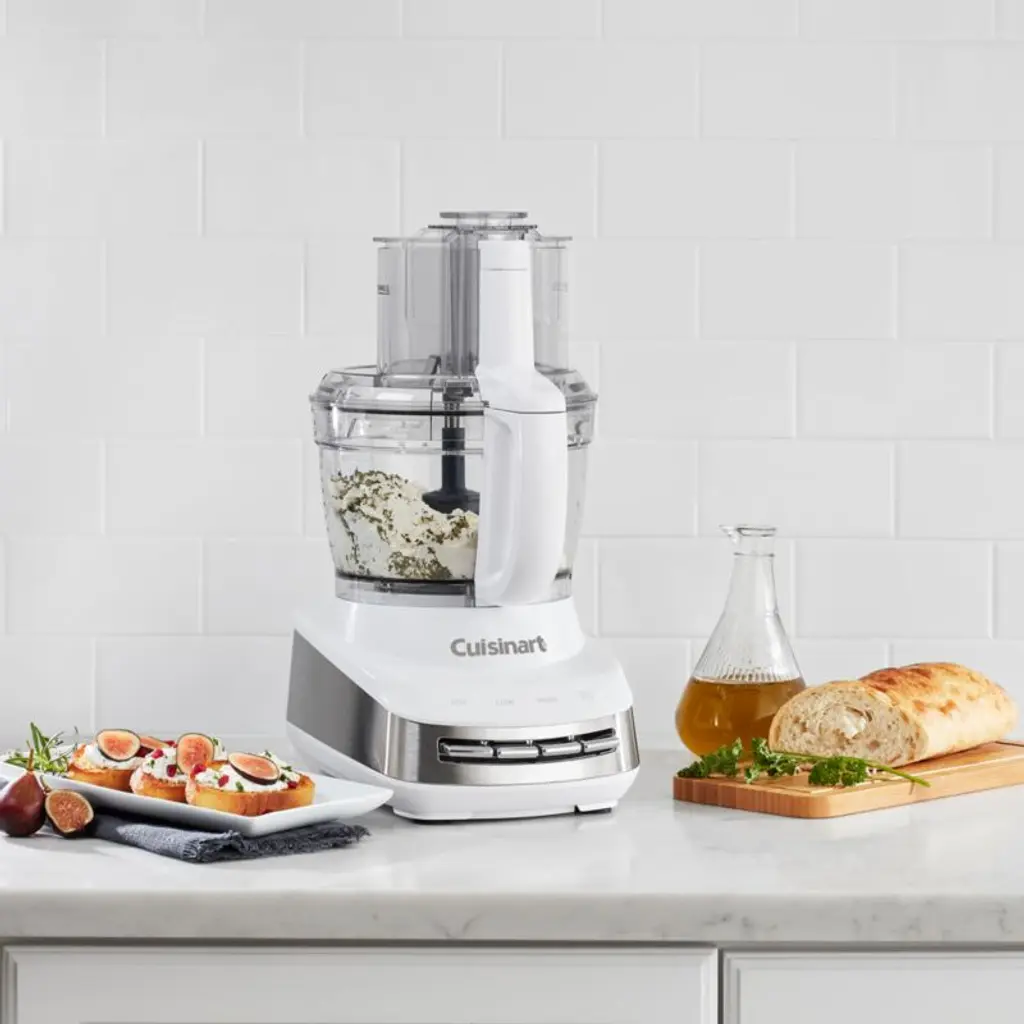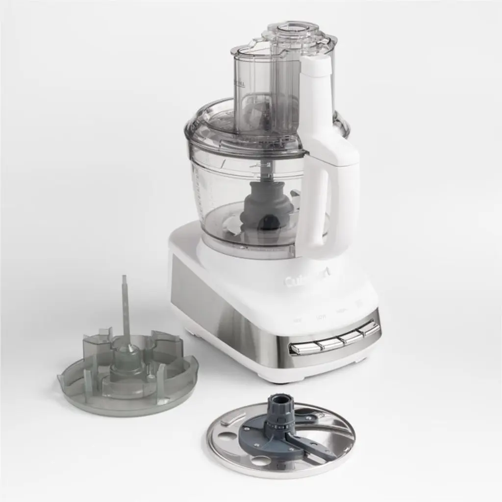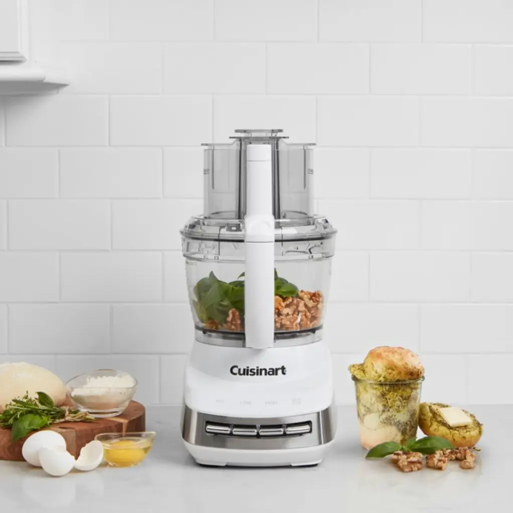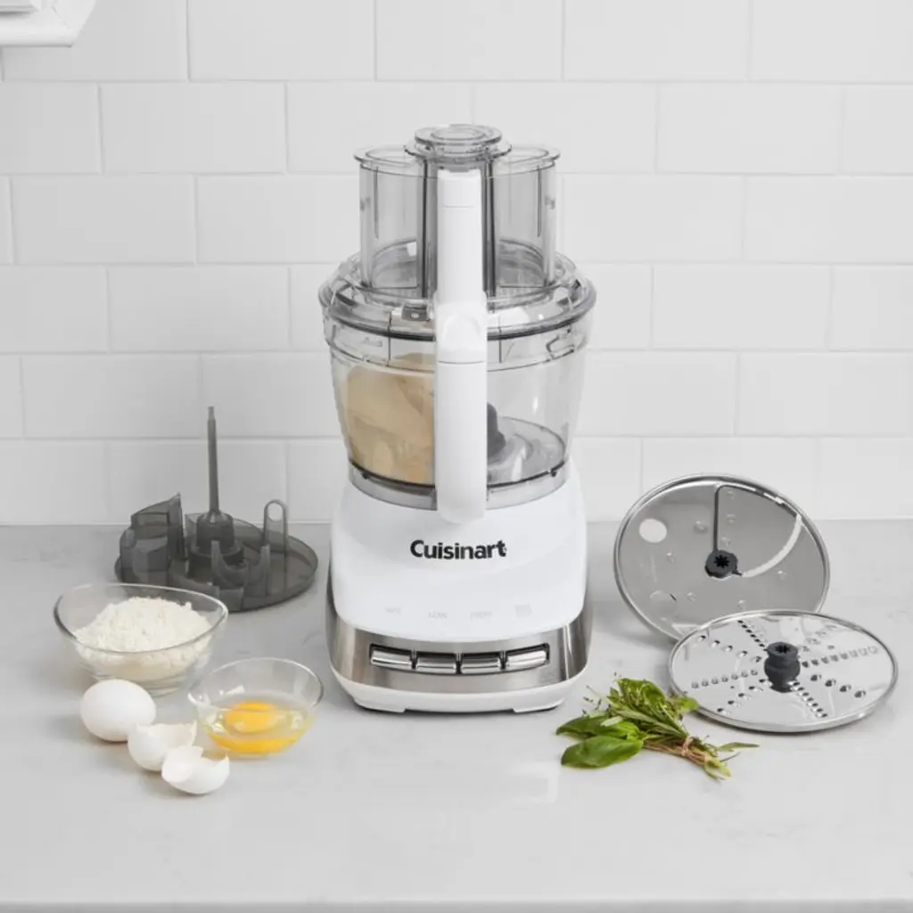 This kitchen workhorse speeds along prep and cooking, with a powerful motor for making quick meals, weeknight dinners or weekend celebrations. With a sleek countertop presence in bright white accented with stainless steel, the processor features a large-capacity work bowl made of durable Tritan that can accommodate large batches of salsa, hummus, bread dough or slaw. The adjustable slicing disc, reversible shredding disc and multi-purpose blade nest together in a removable storage hub. Take your meal prep to the next level by customizing the food processor with Cuisinart Core Essentials blender, juices extractor, dicing kit, specialty discs, and small work bowl accessories sold separately.Cuisinart has been creating inventive and accessible kitchen appliances, cookware and accessories for nearly 50 years.
