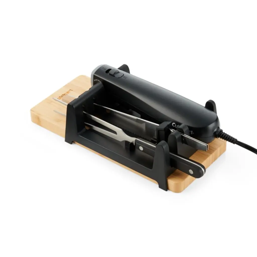 Slice bread, meat, poultry and more with ease using this comprehensive slicing set. A sleek black tray holds an ergonomic power handle, stainless steel carving/serving fork, and a stainless steel blade. The tray fits over a bamboo cutting board, creating a compact and easy-to-store electric knife set. The ultra-sharp, micro-serrated blade cuts consistent slices for an elegant dinner presentation, while the serving fork provides a sturdy hold. Suitable for both right- and left-handed cooks, the ergonomic handle is comfortable to use even for extended slicing sessions. Perfect for carving turkeys, geese and grand roasts, this convenient set is a must for holiday entertaining. Need help choosing? Here's your essential guide to choosing the best knife