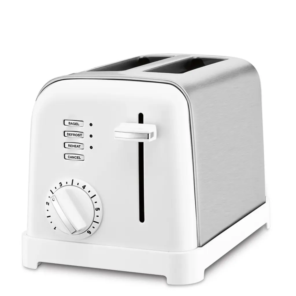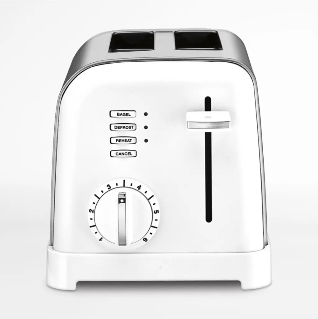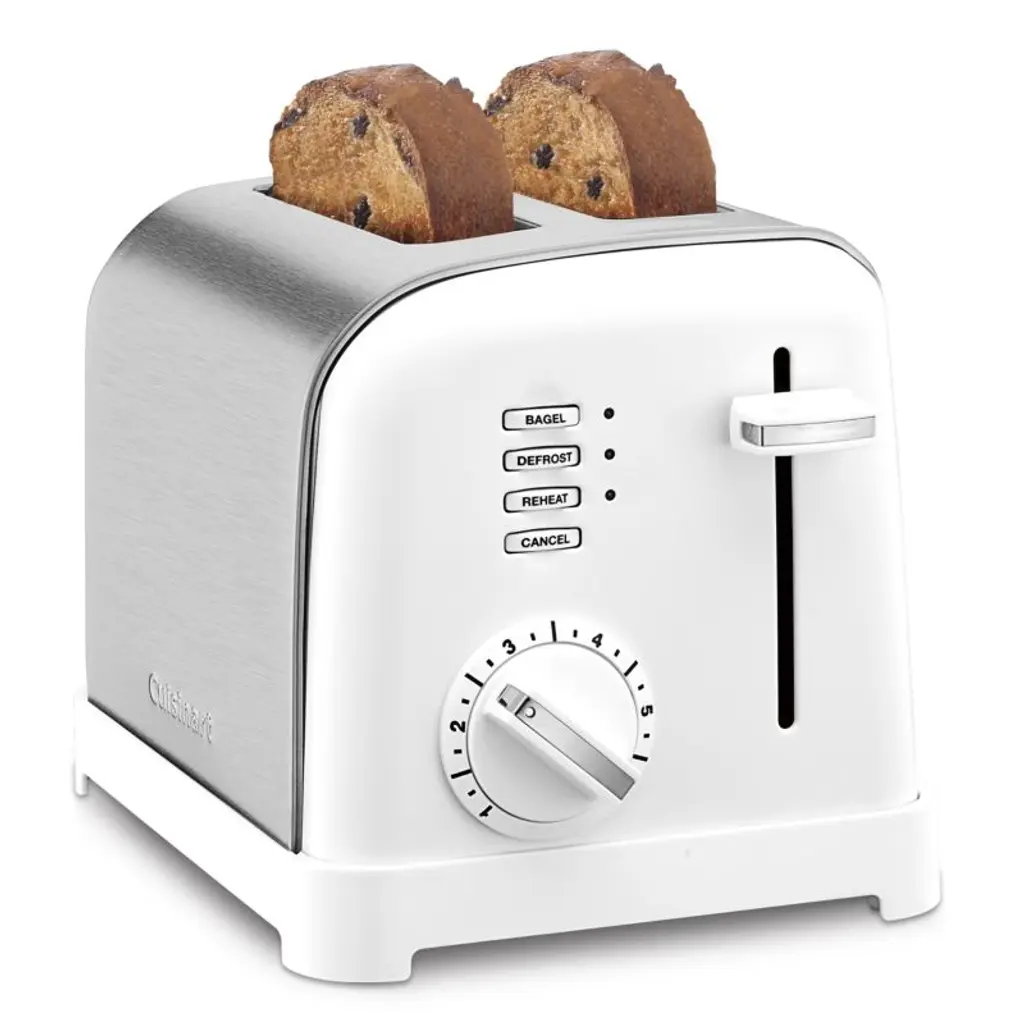 Modern function with a retro, commercial look for your kitchen counter. Classic in stainless steel and matte white, this two-slice toaster features include six-setting browning dials, 1½"-wide slots, lift-lever for small items and a slide-out crumb tray for easy cleanup. The defrost function handles frozen waffles and toaster pastries, the bagel button automatically adds extra time and the reheat function warms without additional toasting.Cuisinart has been creating inventive and accessible kitchen appliances, cookware and accessories for nearly 50 years.