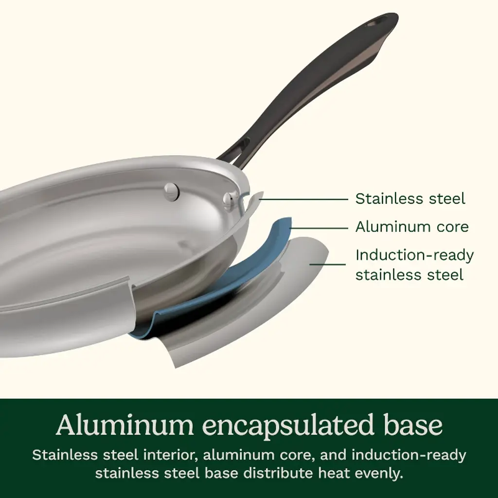 Elevate your cooking experience with the Cuisinart RADIANTPRO Stainless Steel 10 Qt. Stockpot with Cover, designed for both elegance and performance. Featuring a soft arc design, this Sauté Pan has a high-polished stainless steel exterior that brings a touch of sophistication to any kitchen. The aluminum encapsulated base delivers fast, even heating. The wide grip handles, enhanced with a brushed titanium PVD finish, provide a secure and comfortable grip. The tempered glass cover features matching brushed titanium PVD finish on lid pull. Measurement markings on the interior make it simple to follow any recipe. Built for versatility, this collection is compatible with all stovetops, including induction, and is dishwasher safe for effortless cleanup. Lifetime warranty.Cuisinart: From our state-of-the-art kitchen products to the moments and meals you create with them — when you bring more joy to the heart of your home, everything’s A Work of Cuisinart.