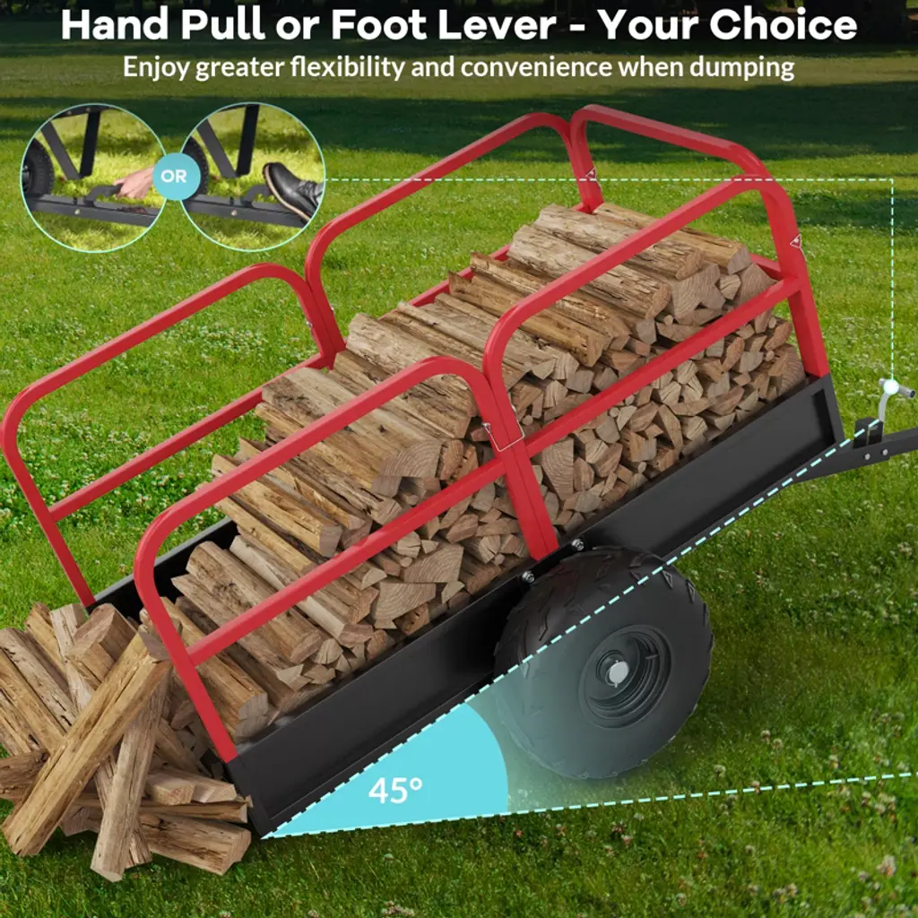 Quick Highlights:- Connect the hitch of the garden trailer to your tractors, lawnmowers, ATVs, and UTVs.- Durable powder-coated steel frame.- large volume meets all your hauling needs.- Reinforced side panels and ribs provide strong load-bearing capacity.- Easily transport heavy items like wood, stones, and bricks.- Hand pull and foot pedal dumping for convenient unloading.- Large pneumatic tires are suitable for all terrains.Specification:Capacity: 17 cu.ftWeight Capacity: 1700 IbsProduct Size: W 54 × D 28 × H 36 inchesPacking List:1 x Heavy-Duty Tow Behind Dump Cart1 x Hardware Pack1 x Assembly Manual