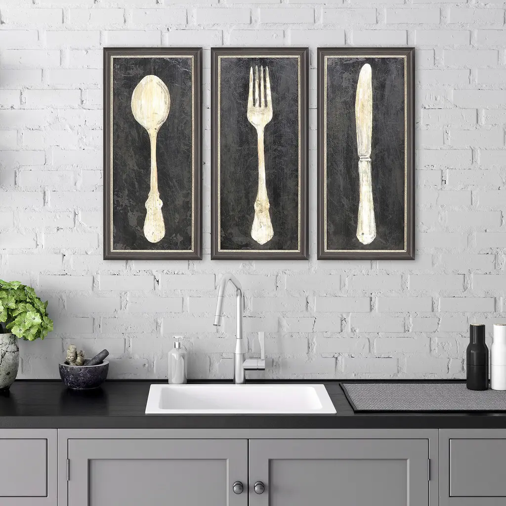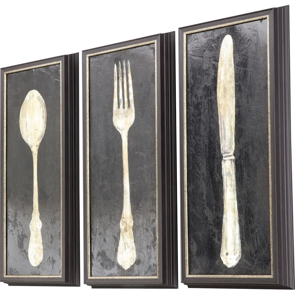 Utensils take the spotlight. A hand applied gel coating with a light brown wax adds an aged accent. Framed in a dark wood finish shadow box moulding.