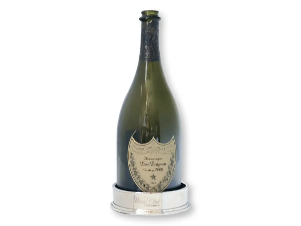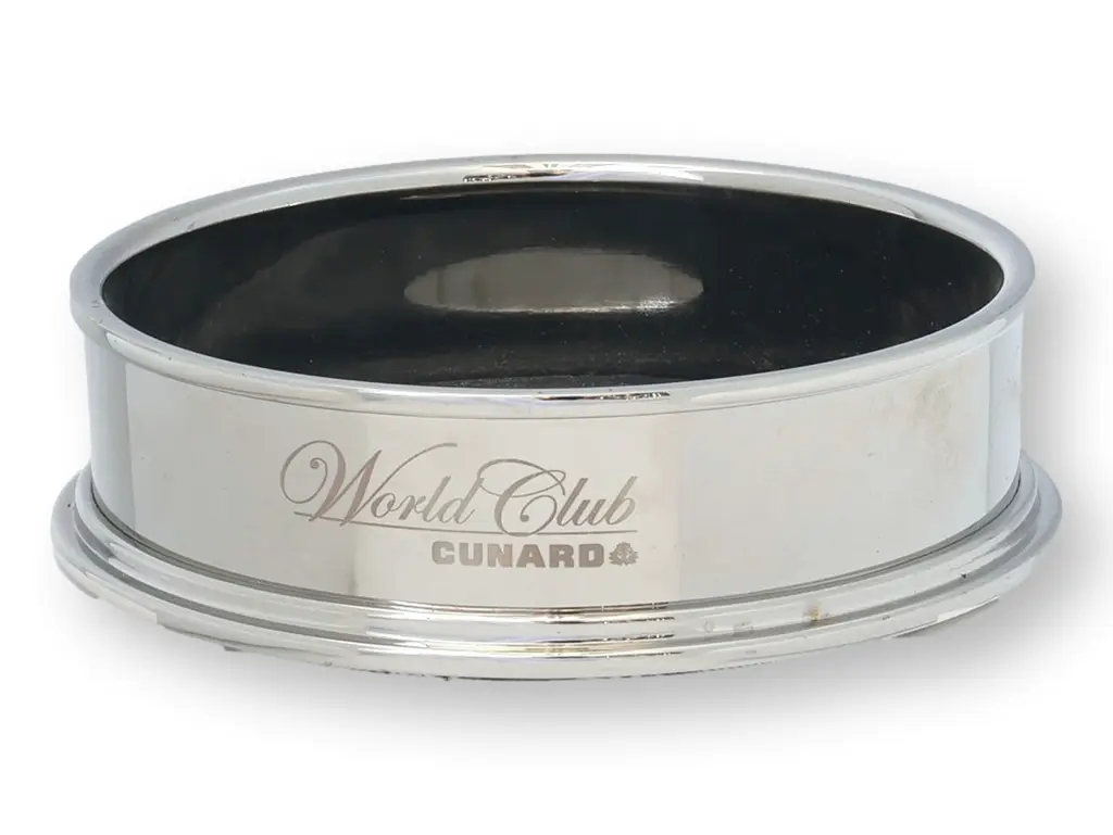 Polished and heavy, silverplate Cunard ��World Club��� bottle coaster, engraved with elegant script and lined with a dark felt interior (interior sides are silverplate, showing with dark reflection of felt bottom). This striking hotel silver piece evokes the luxury and formality of vintage cruise service on Cunard liners. Designed to hold a champagne or wine bottle, it����s both functional and collectible �� a wonderful nod to midcentury travel and dining culture. No maker's mark.