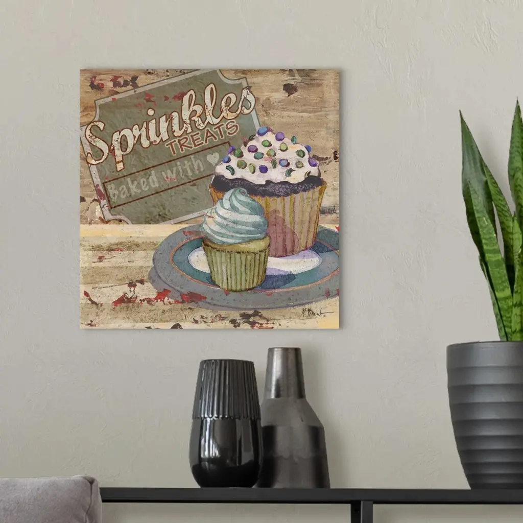 Rustic sign for a bakery featuring a cupcake and the text Sprinkles Treats.
