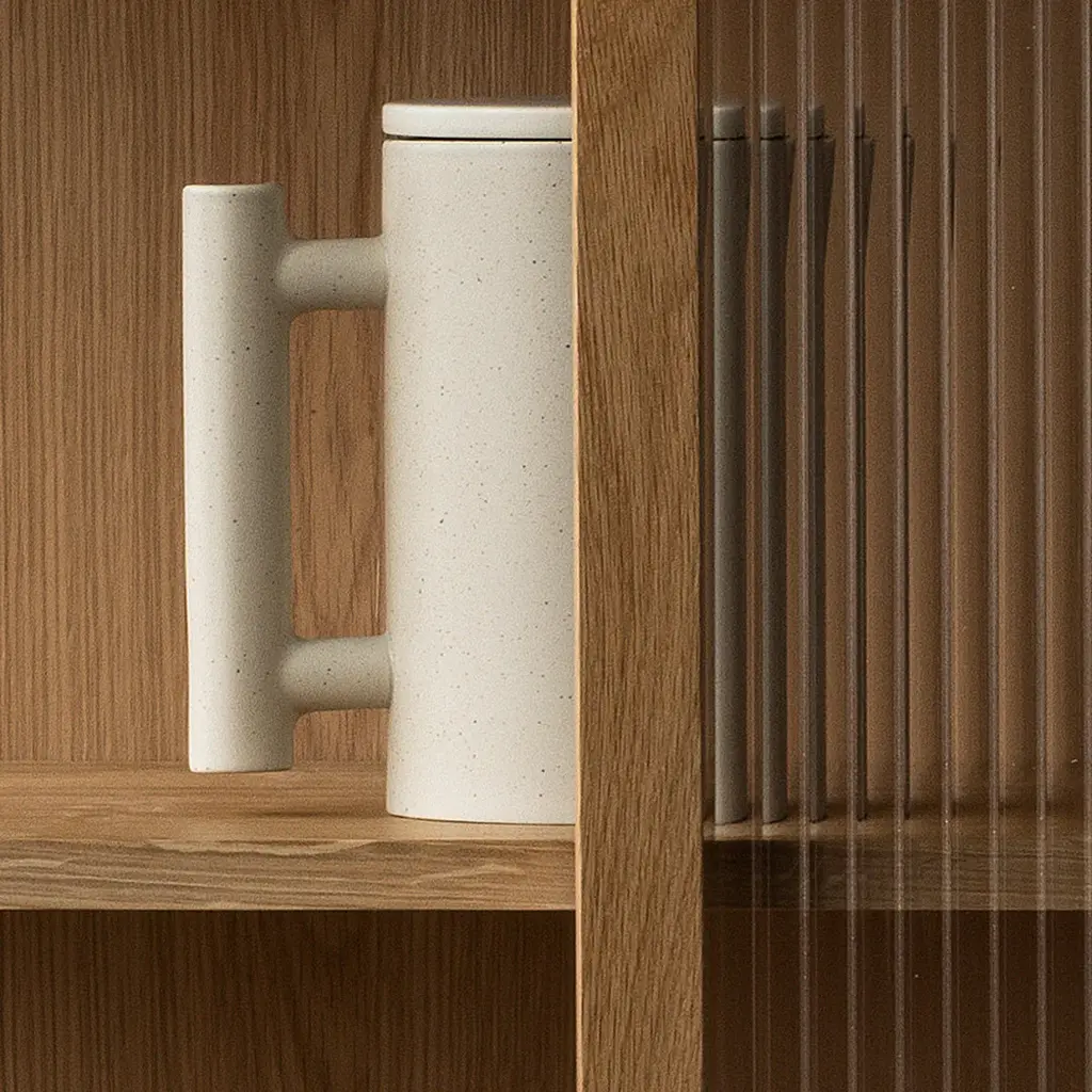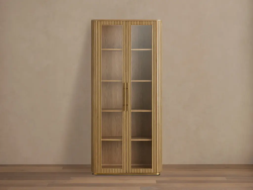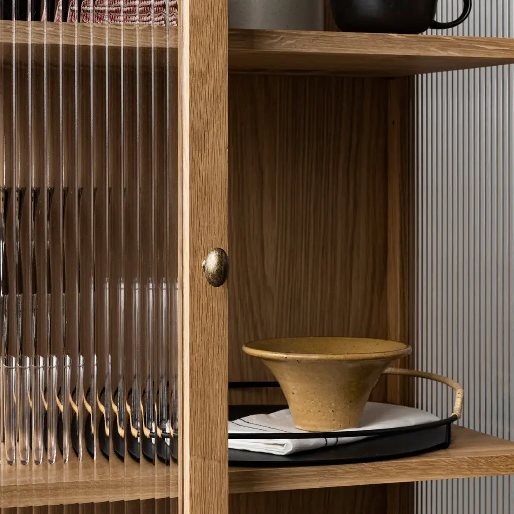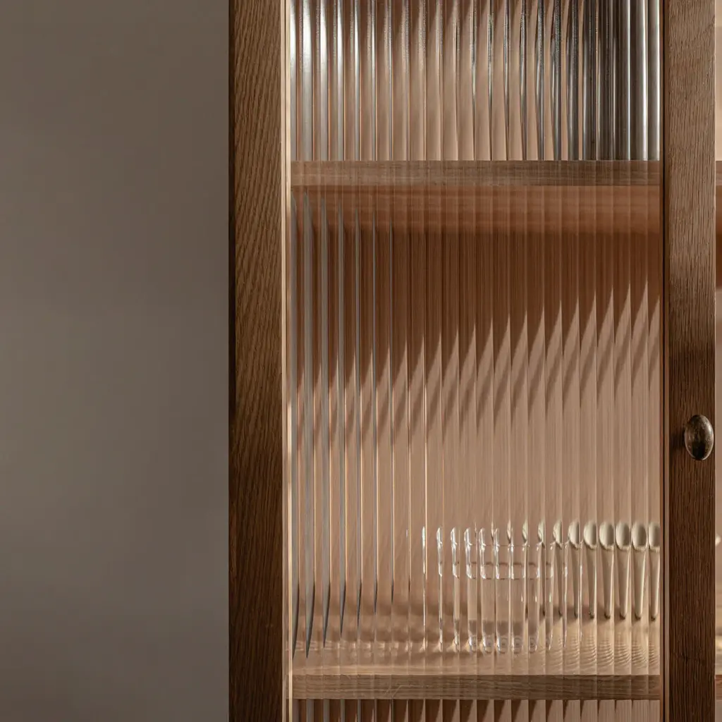 The Curiosity Cabinet features reeded glass panels that not only add a touch of elegance but also cleverly disguise the contents within, maintaining a sense of privacy and order. The cabinet's meticulous attention to craftsmanship and the use of premium materials elevate it to a refined piece of furniture that stands out in any setting.