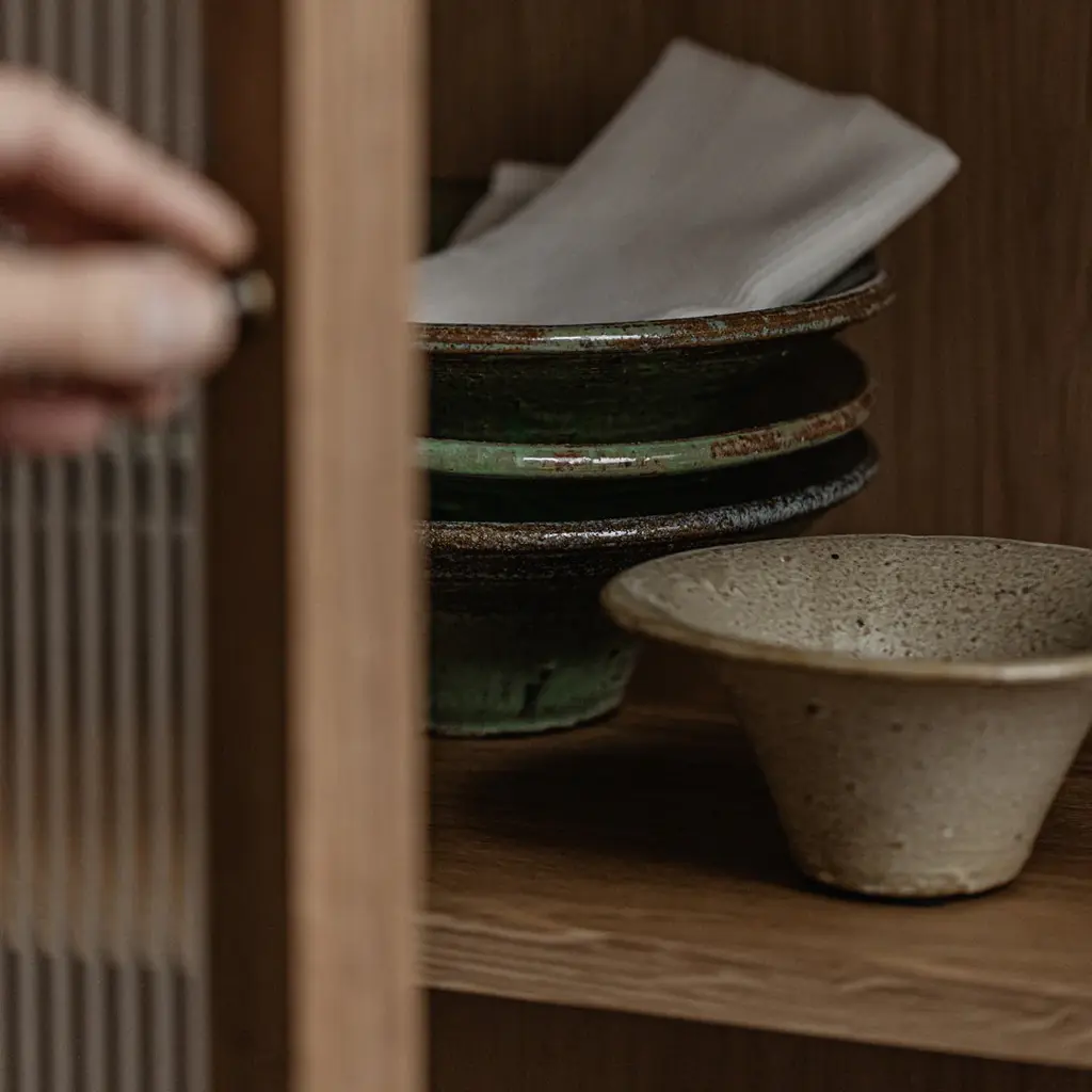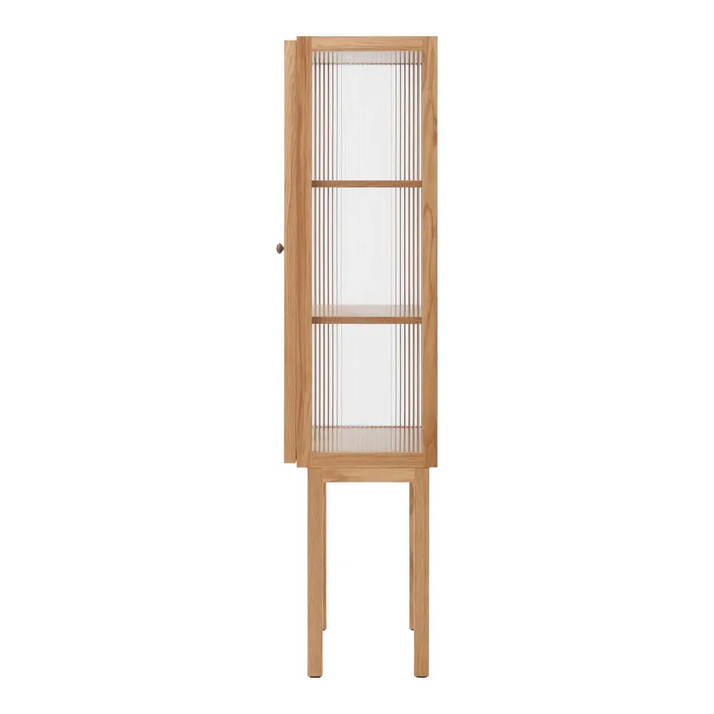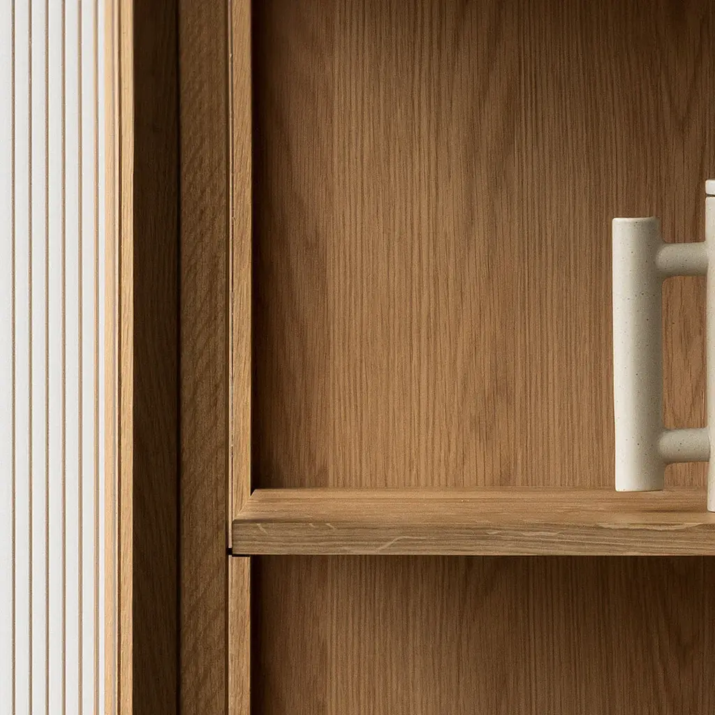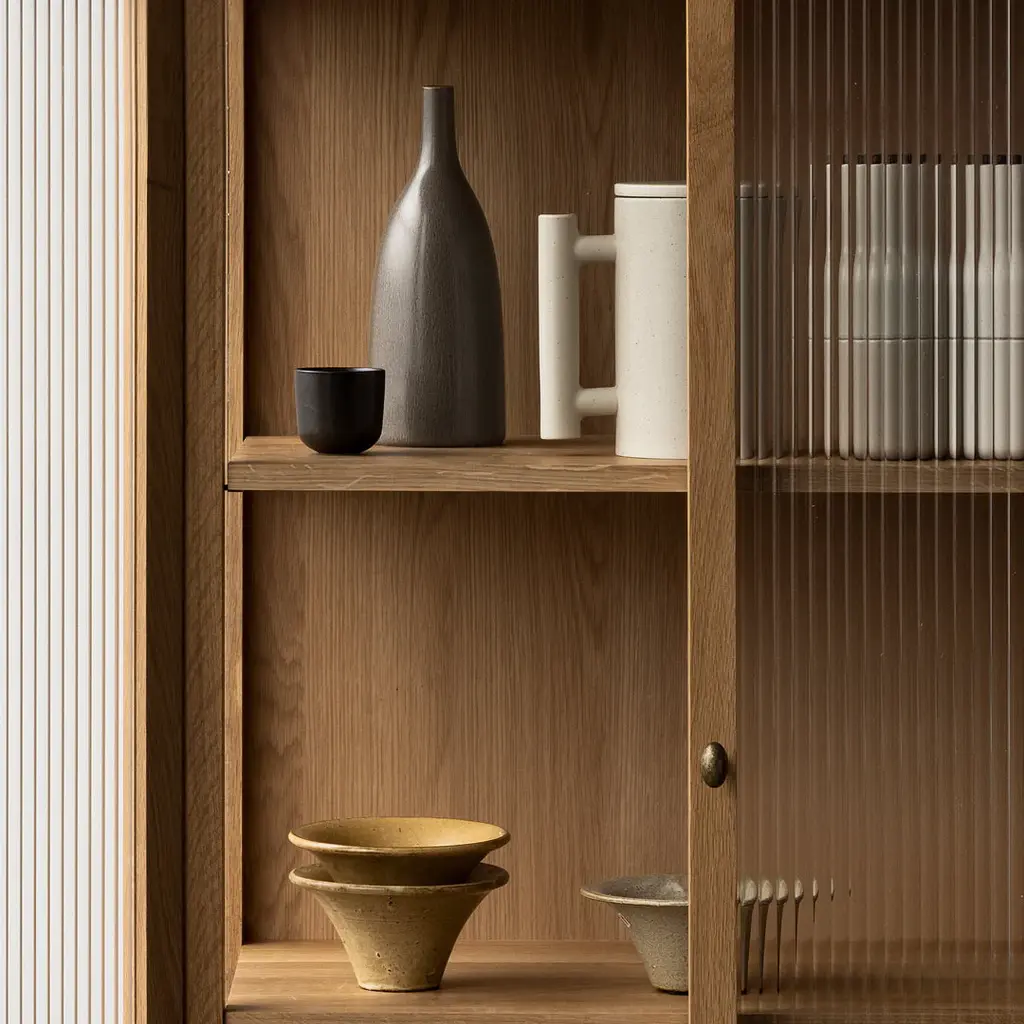 The Curiosity Cabinet features reeded glass panels that not only add a touch of elegance but also cleverly disguise the contents within, maintaining a sense of privacy and order. The cabinet's meticulous attention to craftsmanship and the use of premium materials elevate it to a refined piece of furniture that stands out in any setting.