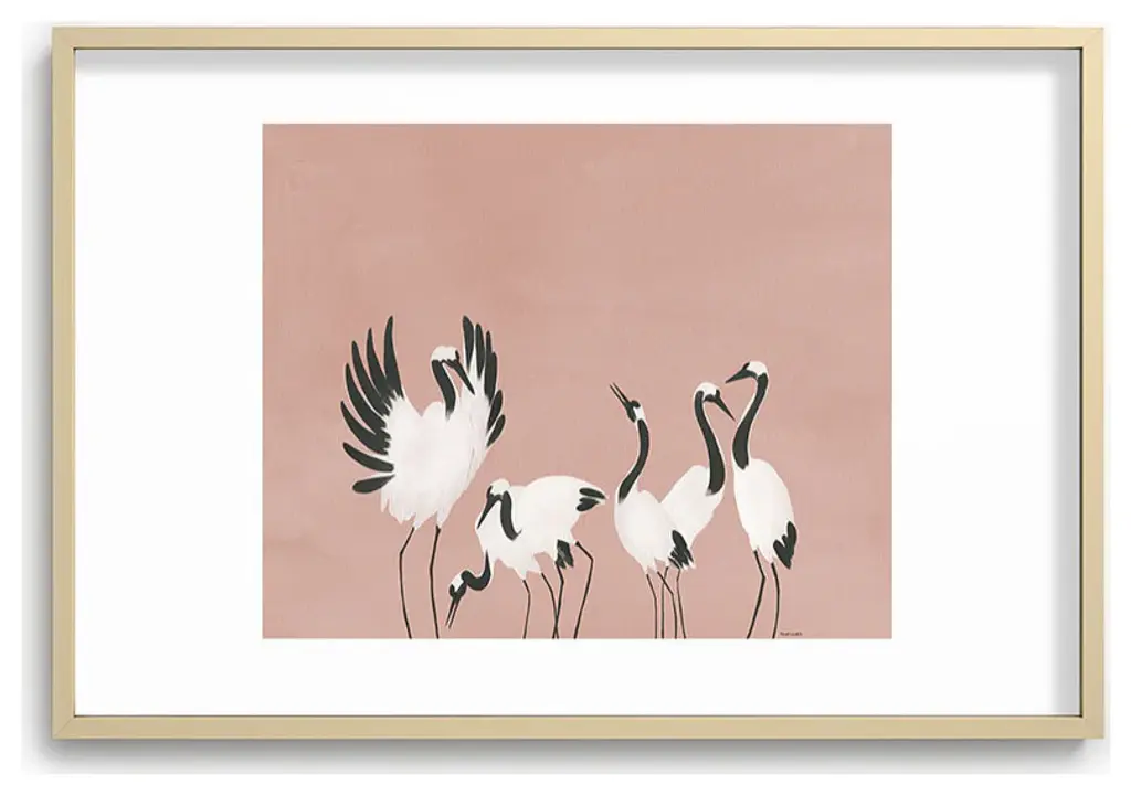 A flock of cranes explore their surroundings. Giclee on canvas is mounted in a warm silver finish floater frame with a satin black side.