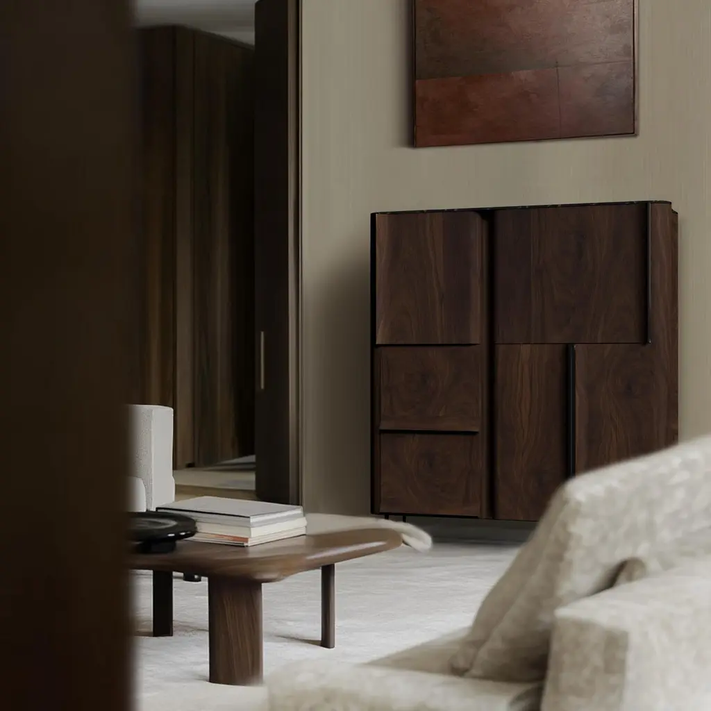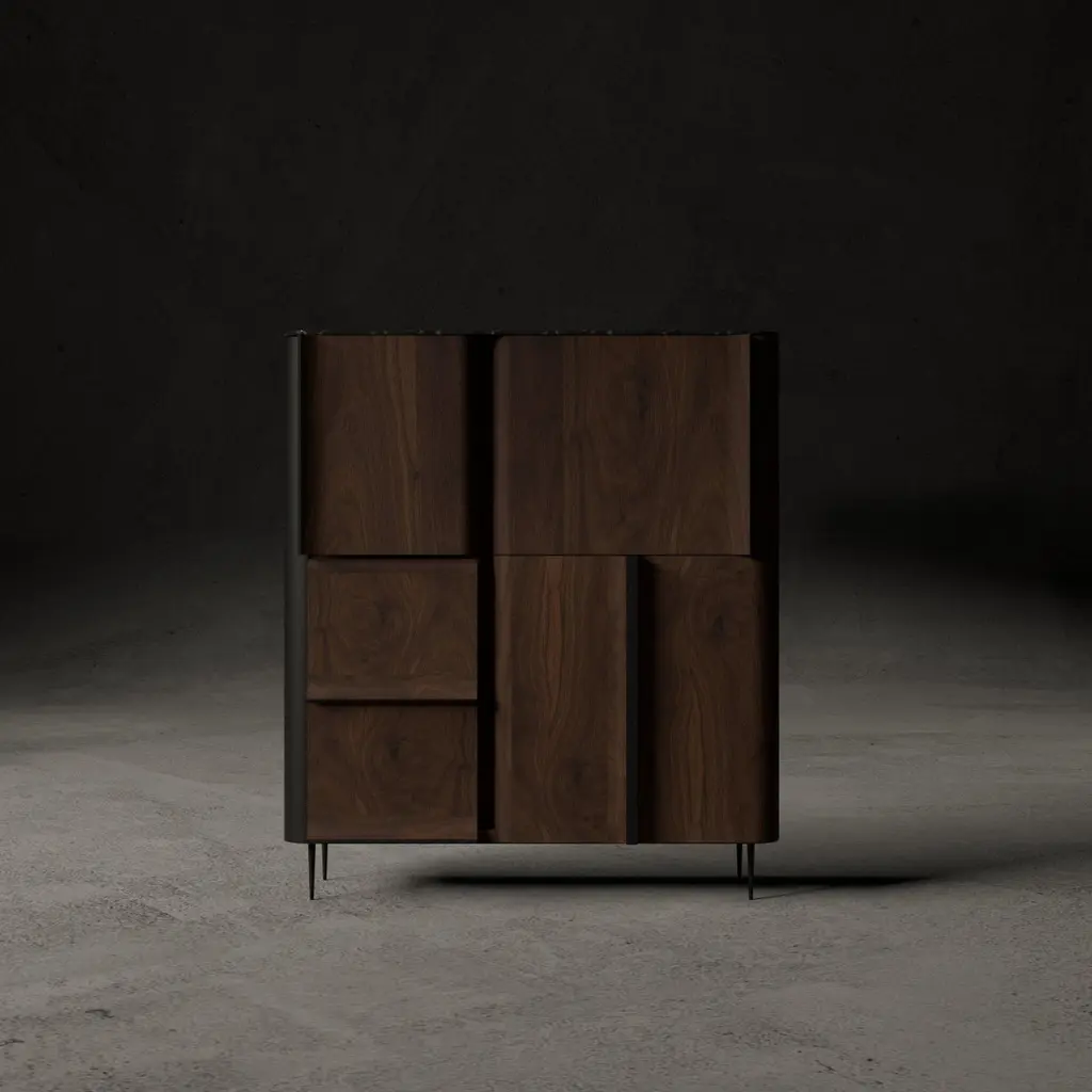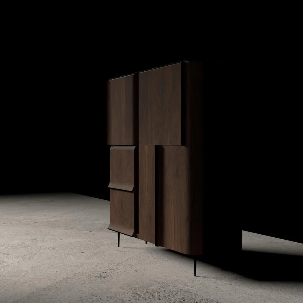 Curl Series Console by hm-LI StudioDimensions: W 140 x D 50 x H 158 cmMaterials: Walnut Wood, Black Lacquered Wood, Blackened Steel Legs, Marble Top Surface.The Curl Series seamlessly combines functionality with elegant design. Itsmulti-directional doors enhance accessibility and spatial interaction. The unique sandwich structure, blending stainless steel and wood, ensures stability and a light visual appeal. Smoothly curved bentwood door panels simplify operation and elevate user experience. With personalized finishes, the collection suits various decor styles, meeting diverse preferences.hm-LI Studio embodies a vision of timeless elegance and luxury in furniture design. Our mission is to blend art, architecture, and nature into creations that resonate with modern relevance and timeless appeal. As more than just a furniture brand, we innovate in the luxury home space, appealing to a broad, eclectic audience united by their pursuit of quality, unique expression, and a deep appreciation for artful lifestyle.
