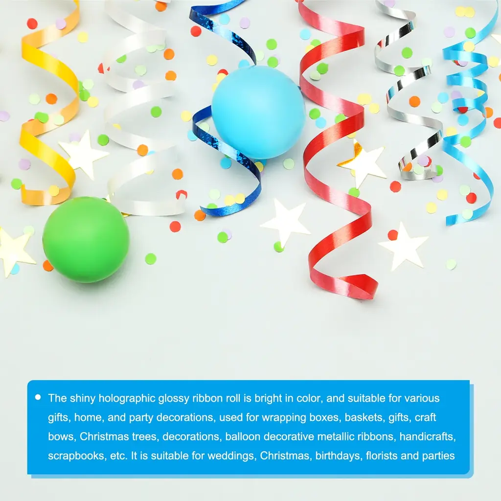 What is this?The shiny holographic glossy ribbon roll is bright in color, and suitable for various gifts, home, and party decorations, used for wrapping boxes, baskets, gifts, Christmas trees, decorations, balloon decorative metallic ribbons, handicrafts, scrapbooks, etc. It is suitable for weddings, Christmas, birthdays, and partiesWhat will I get?Curling ribbon, is in size of : In the package of: Is there any advantages of the product?Crimped curling ribbon shiny metallic is bright in color and has a good decorative effect. Used to decorate various festivals, families, gifts and balloons. Suitable for indoor and outdoor use; Convenient to use, easy to cut, can be used to make various shapes of decorationHow to use it?Steps of installation: 1. Select metallic crimp ribbon with appropriate size; 2. Cut to the length you want; 3. Used as decorative ribbon to decorate balloons, gifts, festivals, weddings, etc.What should I notice?Please select the appropriate size metallic crimp ribbon