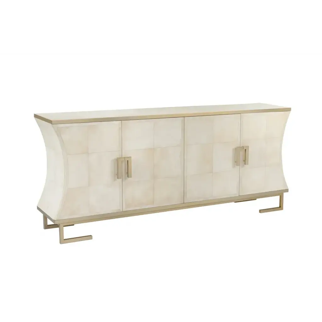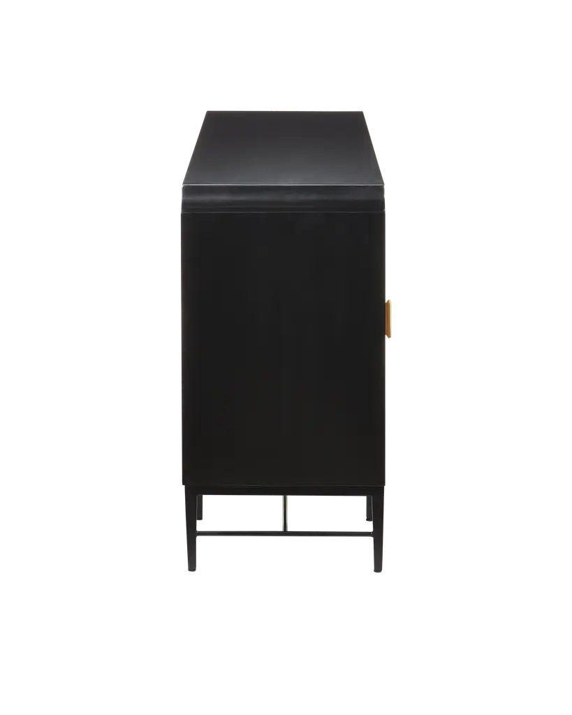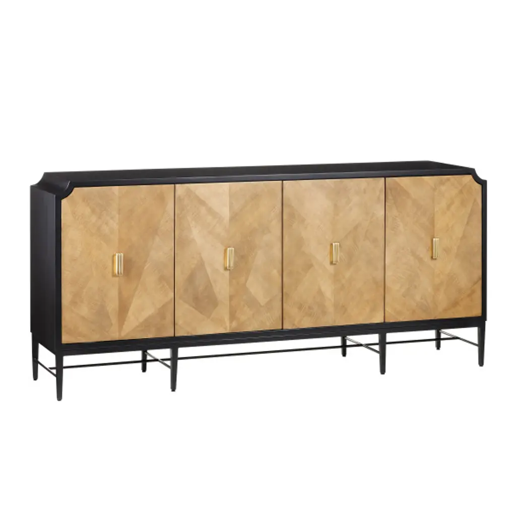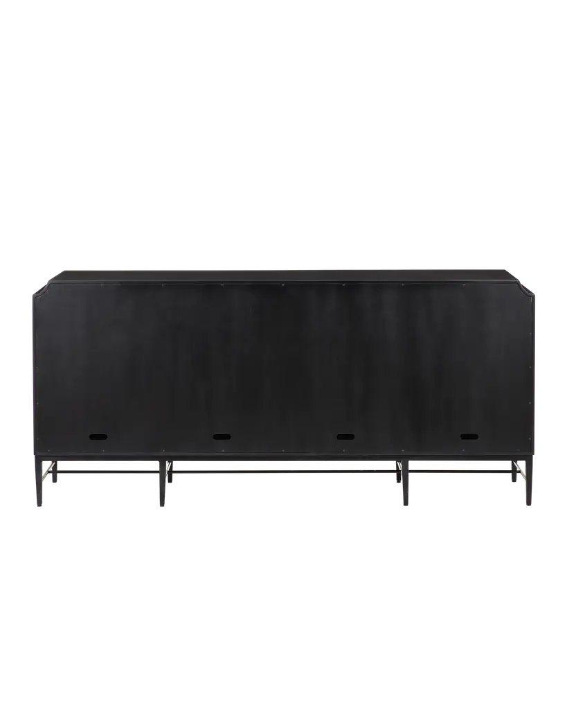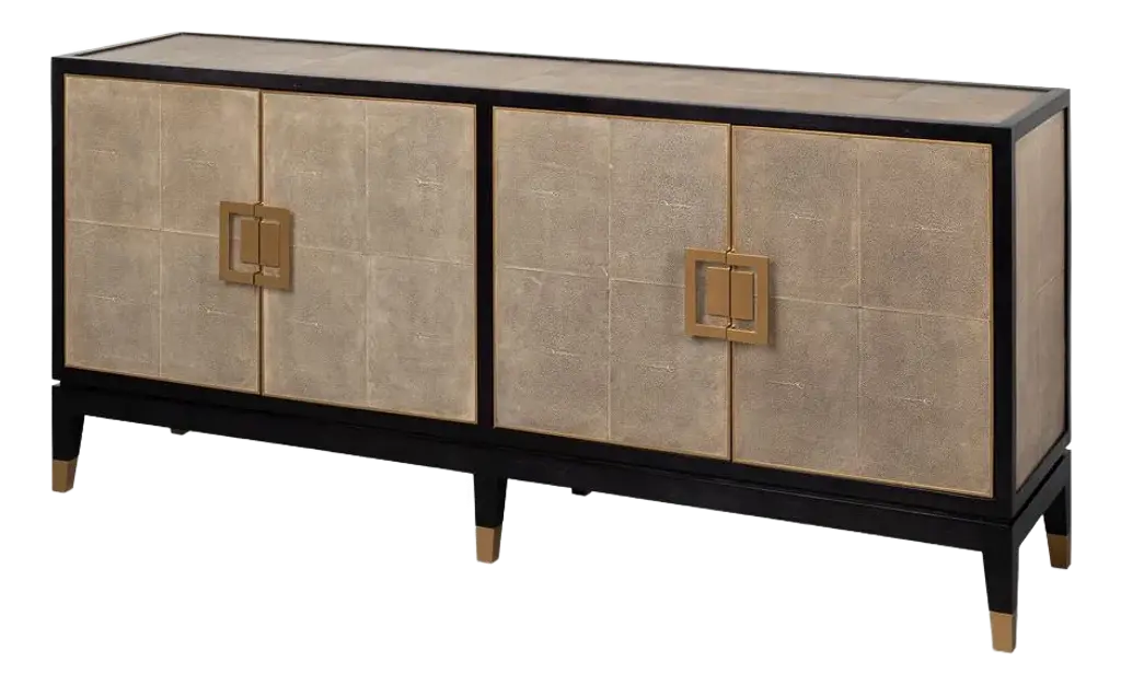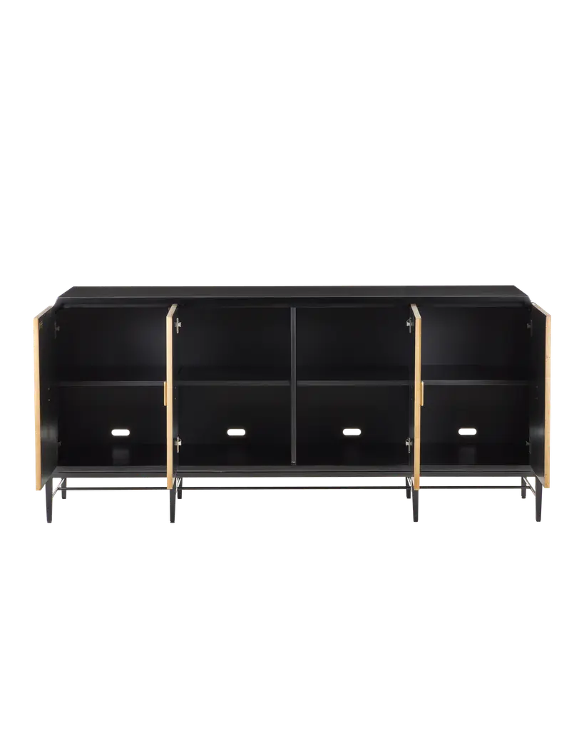 The Kallista Taupe Credenza has a taupe finish that enlivens the figured sycamore veneers on its door fronts. The wood grains bring the credenza a hint of distressing that contrasts the rich black of the cabinet's exterior. The door pulls are in a polished brass finish. Specialty treatments on this artful tan chest include soft-close doors and cord management openings. Wipe clean with a soft, dry cloth or static duster. Always avoid the use of harsh chemicals or abrasive cleaners as they may cause damage to the item's finish. Polyurethane finish Due to the use of natural materials, handmade craftsmanship, or hand finishing, expect some color variances. Hand crafted pieces may have slight size differences.