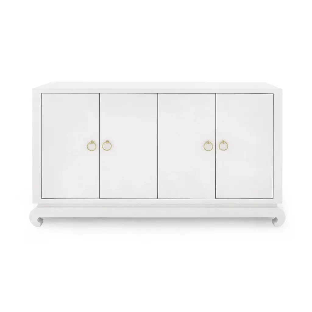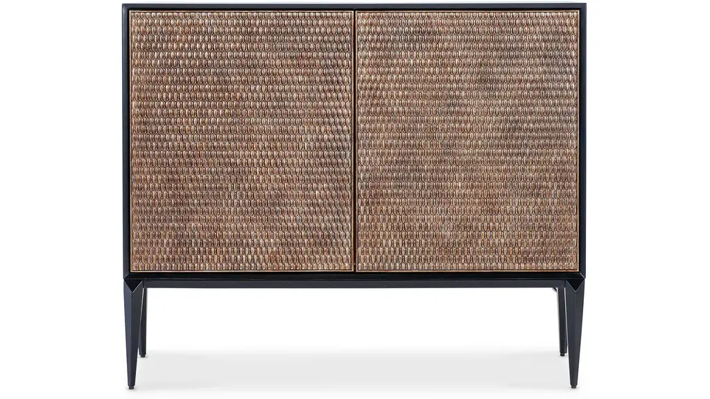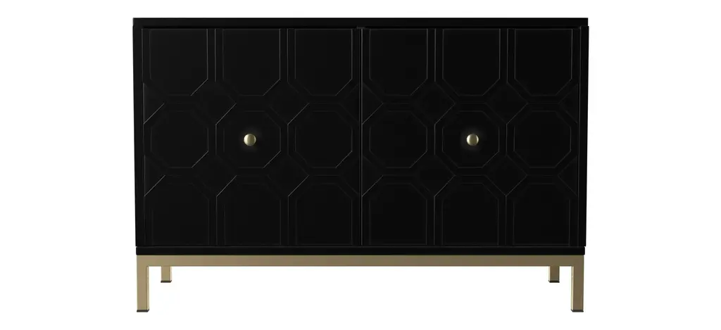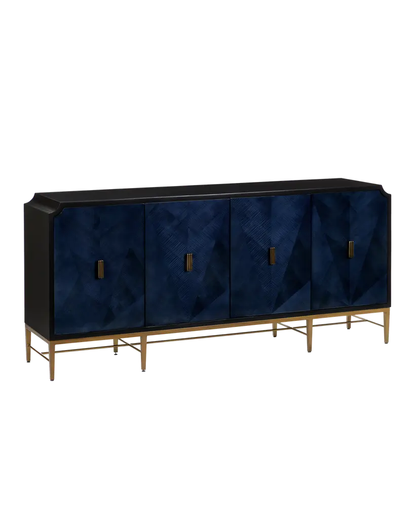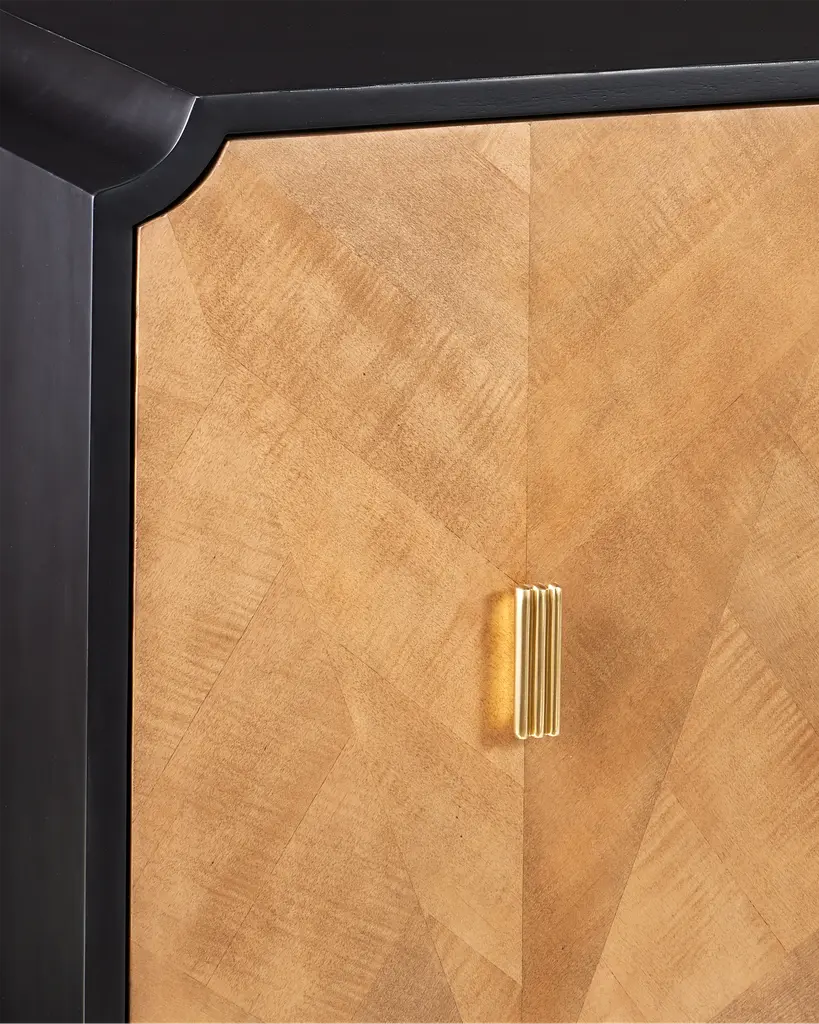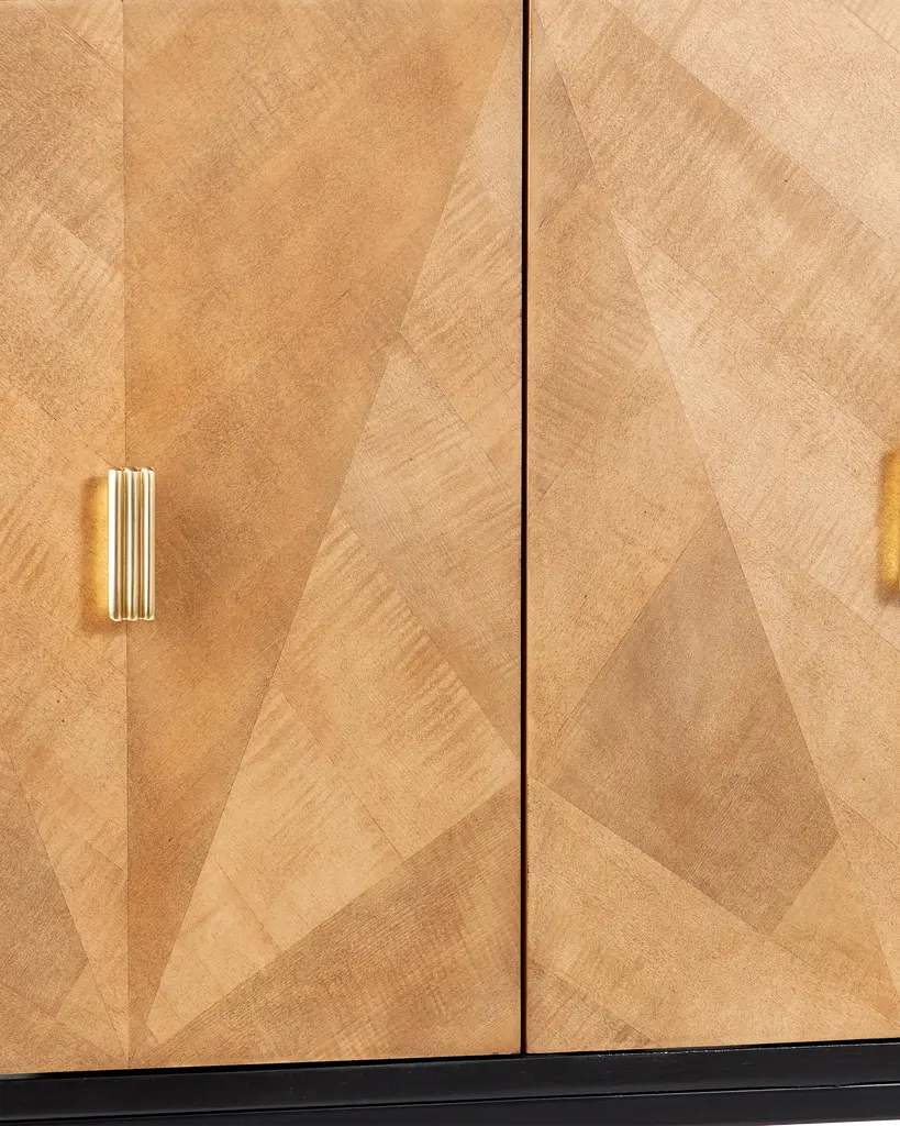 The Kallista Taupe Credenza has a taupe finish that enlivens the figured sycamore veneers on its door fronts. The wood grains bring the credenza a hint of distressing that contrasts the rich black of the cabinet's exterior. The door pulls are in a polished brass finish. Specialty treatments on this artful tan chest include soft-close doors and cord management openings. Wipe clean with a soft, dry cloth or static duster. Always avoid the use of harsh chemicals or abrasive cleaners as they may cause damage to the item's finish. Polyurethane finish Due to the use of natural materials, handmade craftsmanship, or hand finishing, expect some color variances. Hand crafted pieces may have slight size differences.