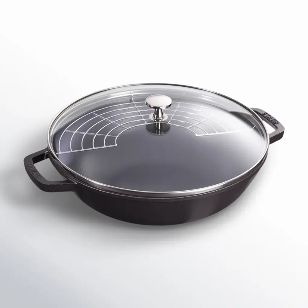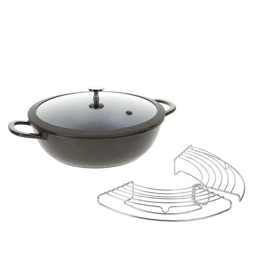 If you enjoy cooking a little bit of everything, Curtis Stone's versatile 4.5 qt. Cast Aluminum Multi-Pan with Lid is for you. This do-it-all pan is perfect for searing, braising or baking. The glass lid fits snugly, retaining heat and moisture and allowing you to monitor food as it cooks. Use it without the lid for stir-frying, deep-frying, sautéing or baking casseroles. Then bring your dish directly from kitchen to table for a family-style feast. Thanks to the Dura-Pan nonstick coating, cleanup is easy. Includes a multi-use rack you can use as a steamer, roasting rack or resting pad—then store easily inside the pan, with the lid on top..Item is Manufacturer Refurbished!When a product is Manufacturer Refurbished, it is tested and checked to operate as a brand new item should. Many times it is as simple as the box being opened by mistake or for quality checks. Once the box has been opened companies cannot legally sell these items as New. Each item is inspected, rerun down the production line and triple checked for quality before being shipped. We are so confident with the quality of our Factory Remanufactured items that we offer a great return policy with every purchase, so buy with confidence!!
