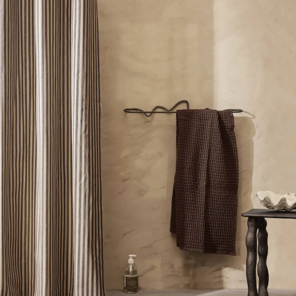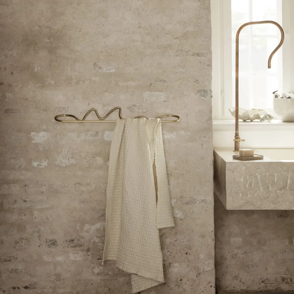 The Curvature Towel Hanger is handcrafted from solid brass with a matte lacquer finish. Each hanger features unique, whimsical curves that add a distinctive touch to any bathroom or kitchen. It's designed to hold towels securely while serving as a decorative element. Available in both Brass and Black Brass finishes, the hanger includes screws and raw plugs for easy installation.