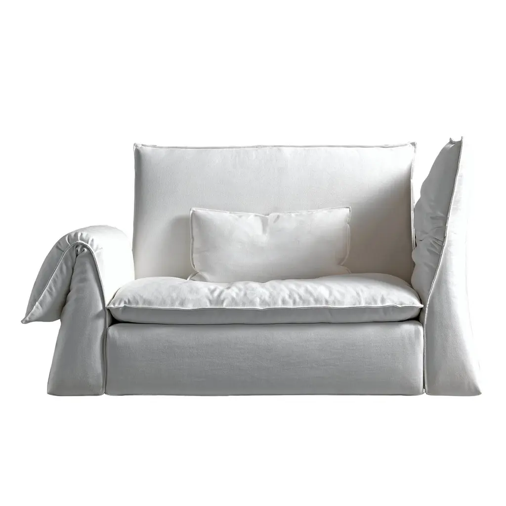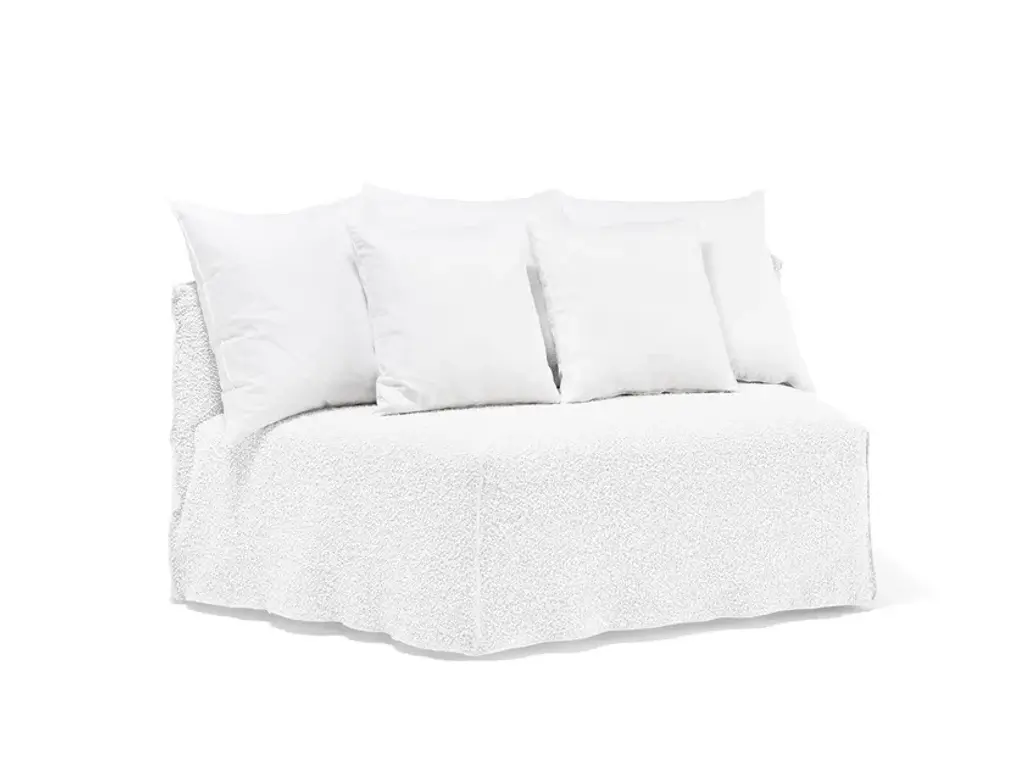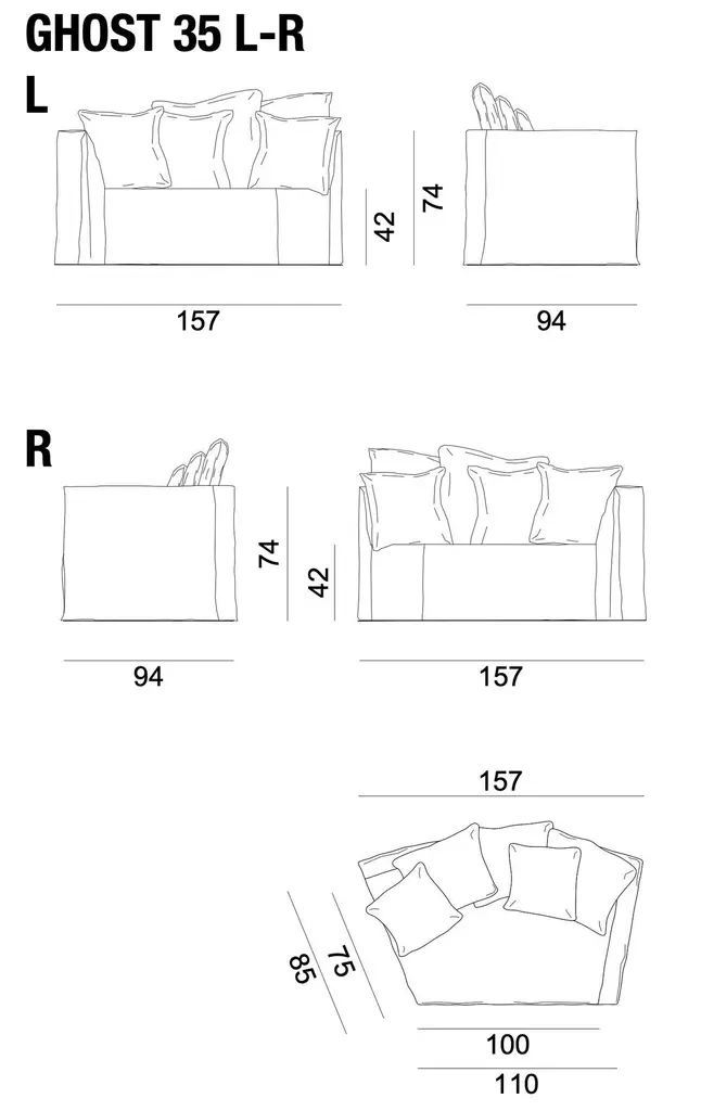 Gervasoni Ghost 35 - Curved Terminal Modular Element (Left or Right Arm)Design: Paola NavoneGhost 35 is a curved terminal modular element, featuring a single armrest available on either the left (L) or right (R) side. The seat, backrest, and frame are padded with polyurethane foam for lasting comfort, while the loose cushions are filled with a feather blend for soft, inviting support. The removable cover ensures easy cleaning and style updates.Design and MaterialsStructure: seat, backrest, and frame padded with polyurethane foam for durable comfort.Cushions: loose cushions filled with a feather blend for plush softness.Upholstery: removable cover. Available in white linen (Category B) or other fabrics on request.FunctionalityModular element: terminal design with single armrest on left (L) or right (R).Removable cover: easy to clean or replace.Premium comfort: soft padding and elegant proportions.DimensionsWidth: 157 cm / 61.8 inDepth: 94 cm / 37.0 inHeight: 74 cm / 29.1 inSeat height: 42 cm / 16.5 inPricePrice refers to the version with white linen cover, Category B.Why Choose Ghost 35 - Curved Terminal Modular ElementFlexible layout: left or right armrest for versatile configurations.Superior comfort: polyurethane foam padding combined with feather-blend cushions.Elegant design: fully padded structure with removable high-quality cover.Versatile style: adapts perfectly to modern, contemporary, or refined interiors.