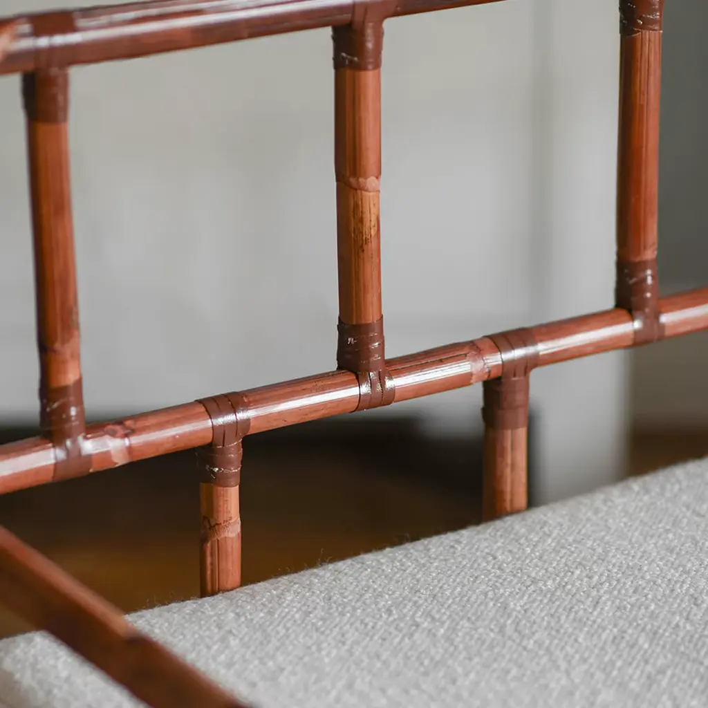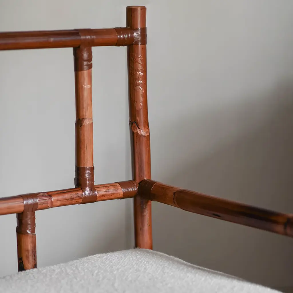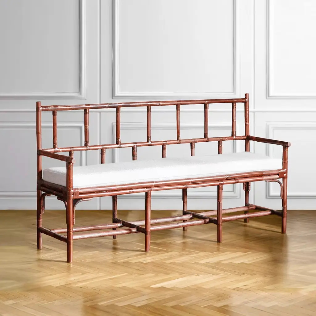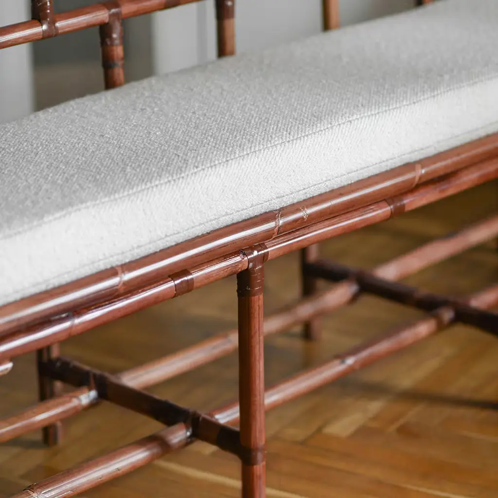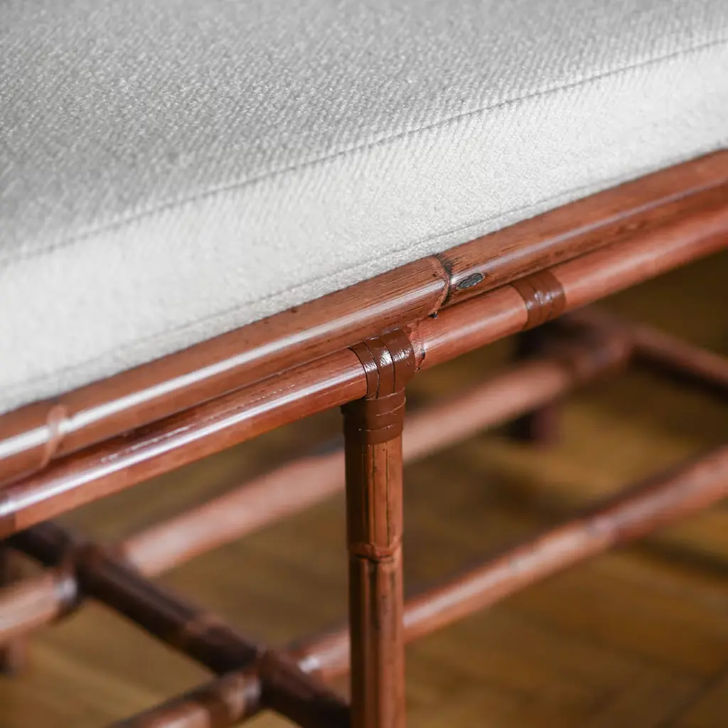 An authentic flair evocative of fascinating Asian rural scenario marks this one-of-a-kind limited-edition bamboo bench. Diligently crafted and finished by hand up to the smallest detail, it flaunts an airy yet rigorous silhouette, enriched with leather bindings and promising long-lasting comfort with its plush cushioned seat covered in bright-white Dedar® fabric.