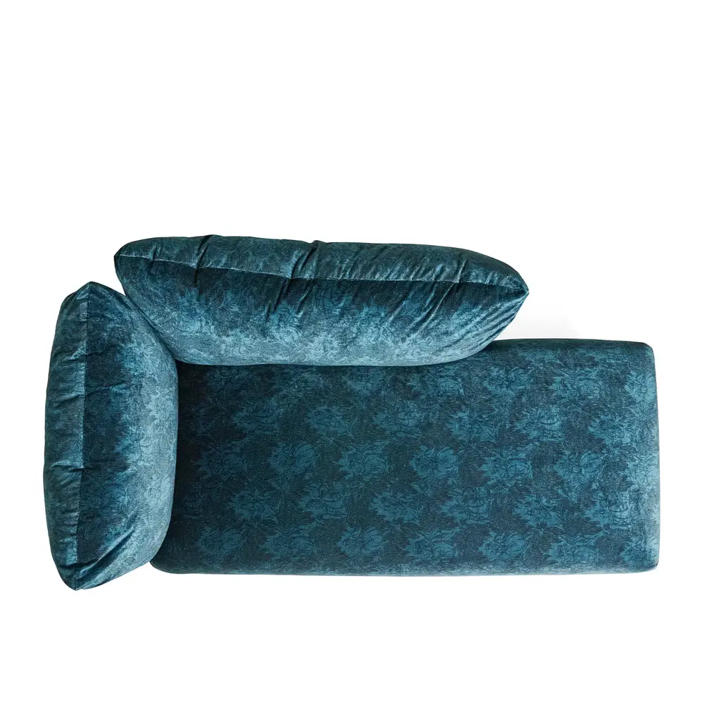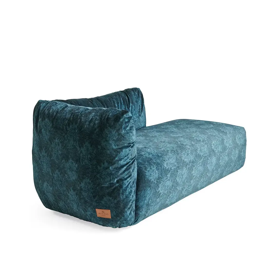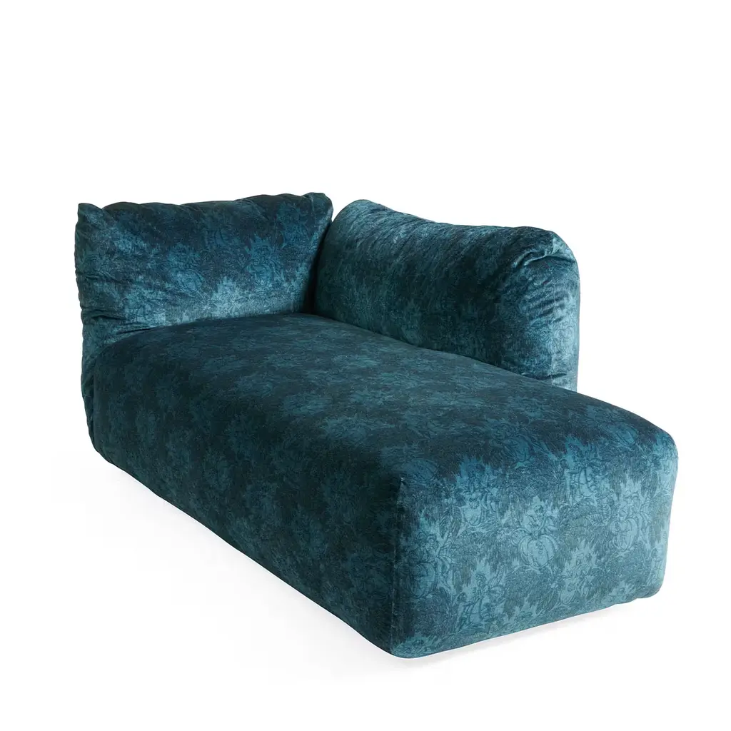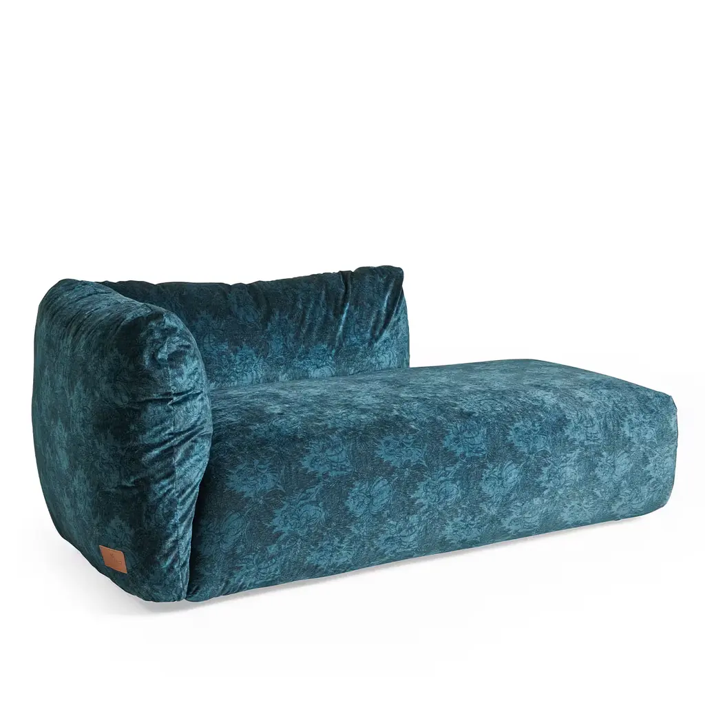 Expression of a new domestic scenario made of expressive colors and immersive fabrics, Cushy is a line of furniture made up of a sofa, armchair, bed, and pouf, all characterized by soft and natural lines, able to convey a sense of welcome and intimacy. The upholstery enhances the contemporary appeal of the dormeuse. Left dormeuse with structure in solid poplar wood and multilayer pine wood. Seat in variable thickness high-density expansive polyurethane foam.