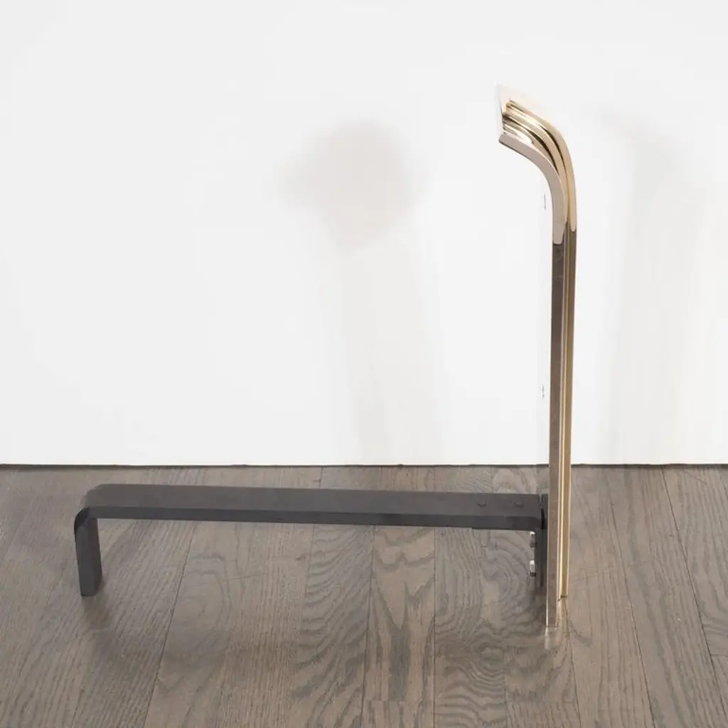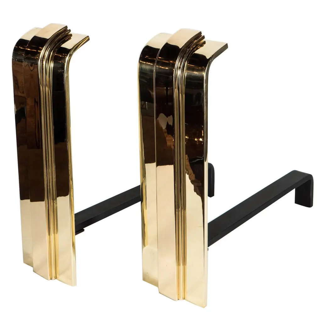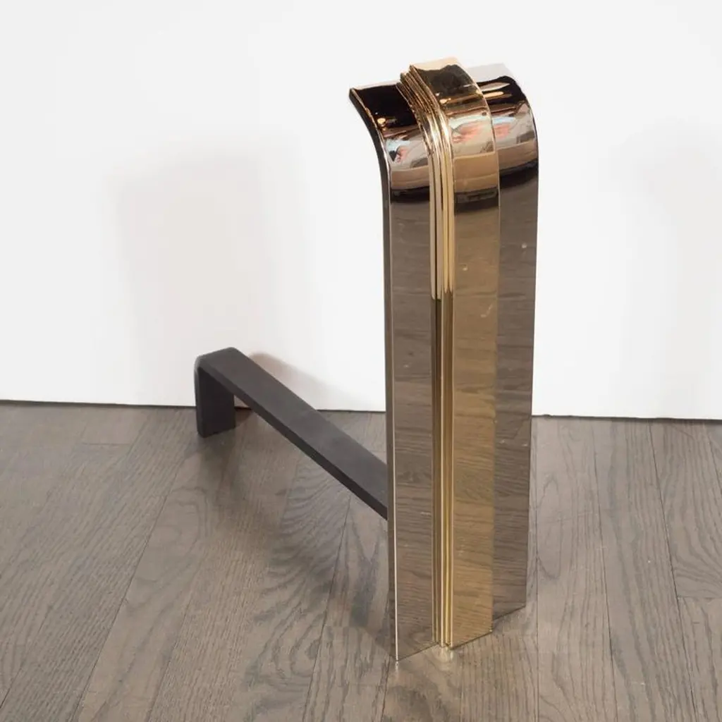 Custom Art Deco Style Skyscraper Andirons Displayed In Polished Brass And Nickel