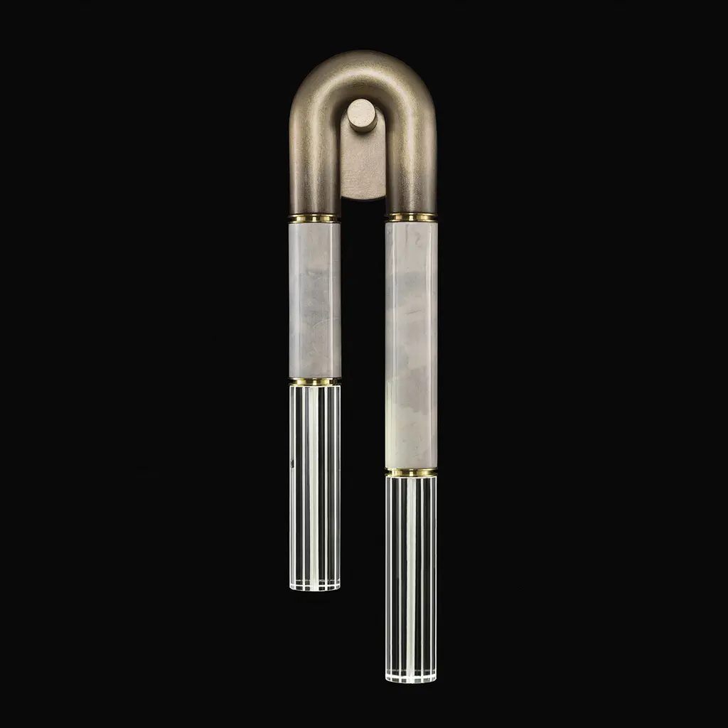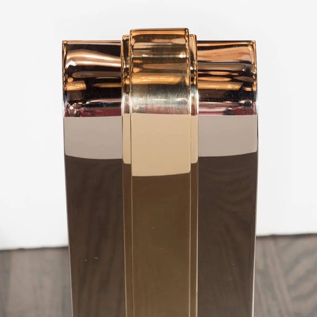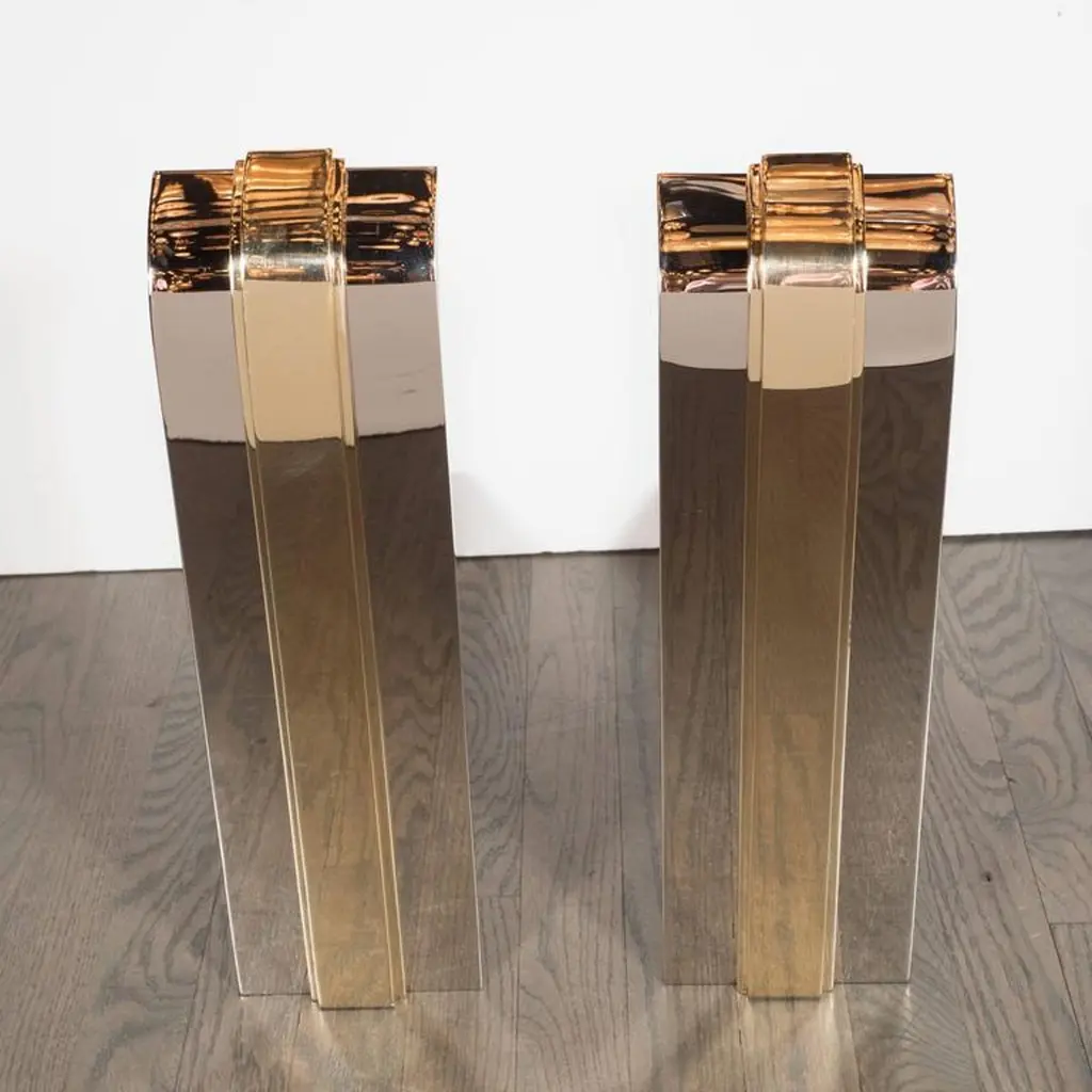 Custom Art Deco Style Skyscraper Andirons Displayed In Polished Brass And Nickel