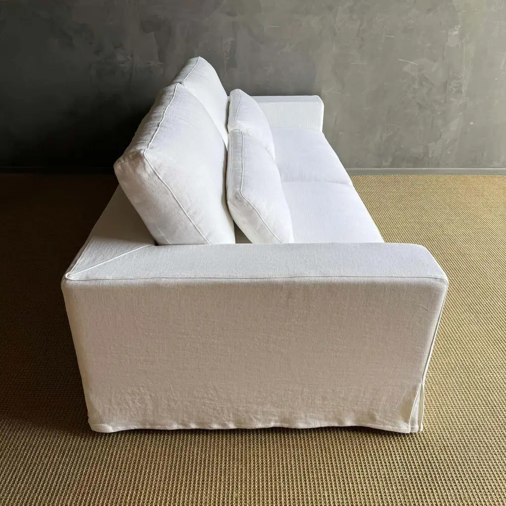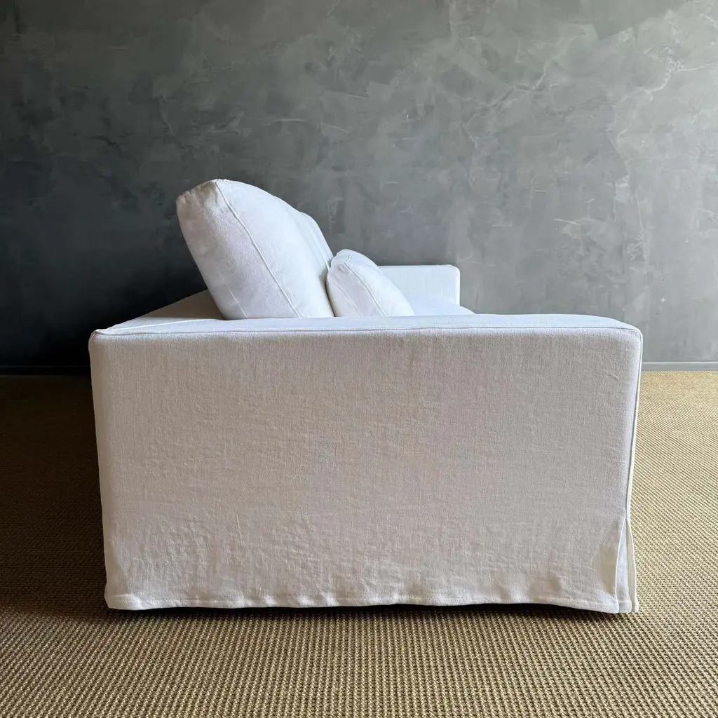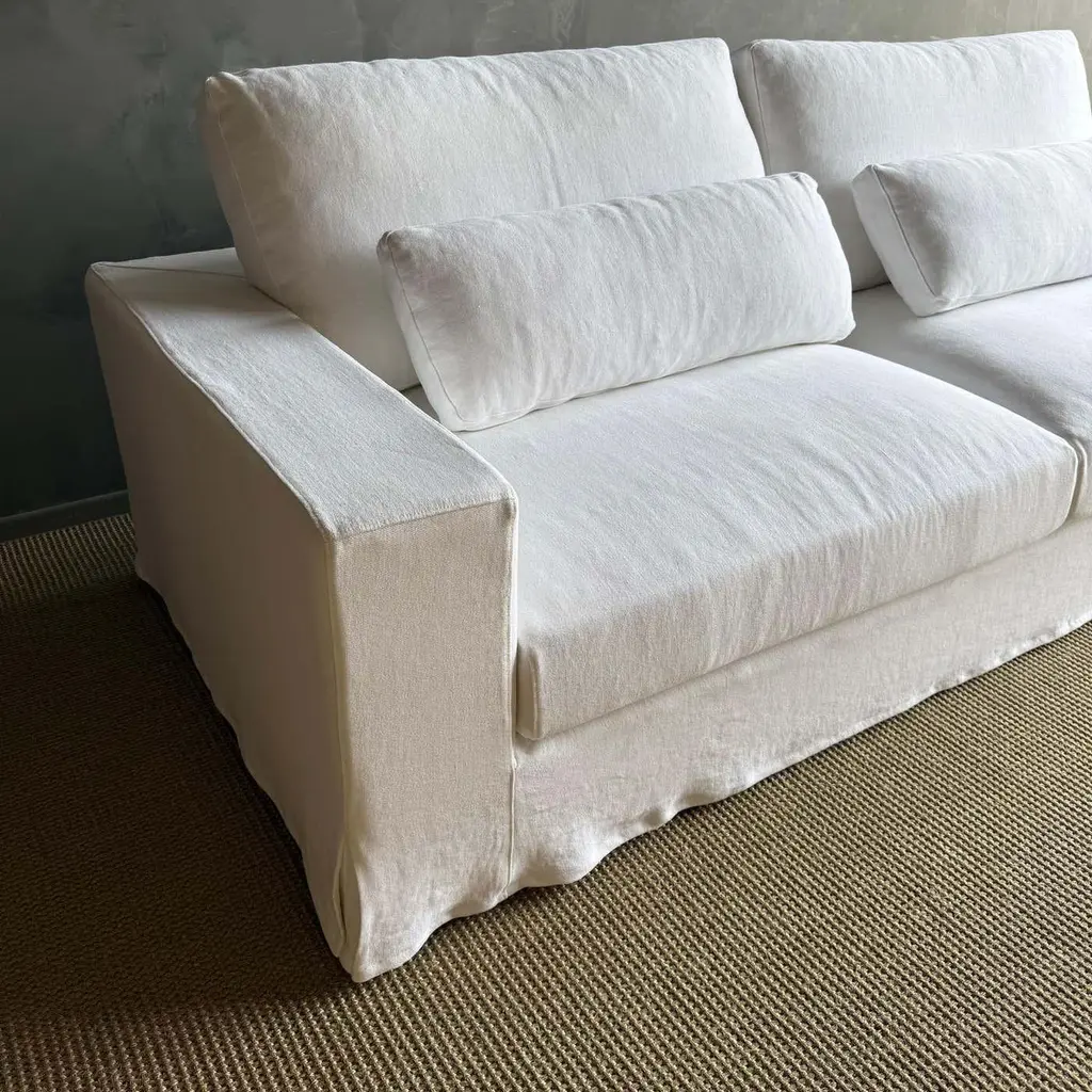 Introducing a slip-cover sofa crafted with Belgian white stone-washed linen, exuding a timeless elegance in any living space. The down cushions add a touch of luxury while ensuring maximum comfort for relaxing evenings. Ideal for both style and coziness, this sofa is designed to be a versatile centerpiece in your home, inviting you to unwind in its soft embrace. With its understated sophistication and plush seating, this slip-cover sofa is a perfect blend of comfort and chic design, elevating the ambiance of your living room. 95" x 43" d x 36" back height with cushions 24" h without back cushion Seat depth 26" with cushions Seat width 78" Arm width 8" Arm height 24"