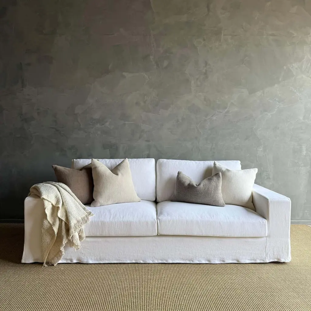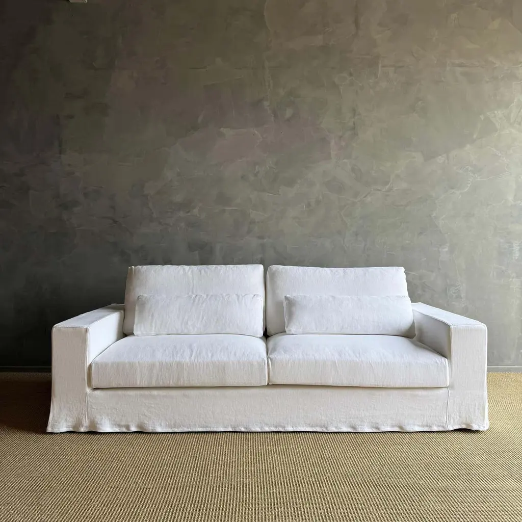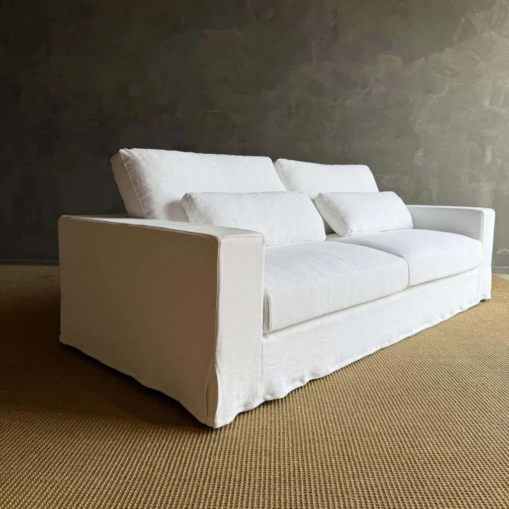 Introducing a slip-cover sofa crafted with Belgian white stone-washed linen, exuding a timeless elegance in any living space. The down cushions add a touch of luxury while ensuring maximum comfort for relaxing evenings. Ideal for both style and coziness, this sofa is designed to be a versatile centerpiece in your home, inviting you to unwind in its soft embrace. With its understated sophistication and plush seating, this slip-cover sofa is a perfect blend of comfort and chic design, elevating the ambiance of your living room. 95" x 43" d x 36" back height with cushions 24" h without back cushion Seat depth 26" with cushions Seat width 78" Arm width 8" Arm height 24"