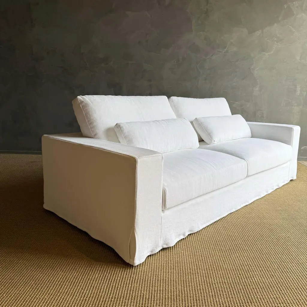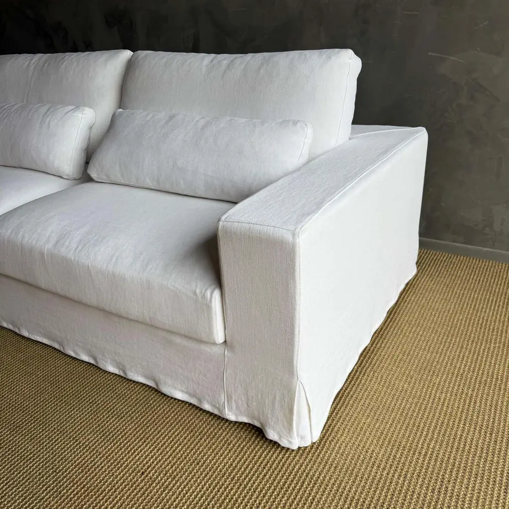 Custom Made White Belgian Linen Slipcover Sofa With Down Cushions