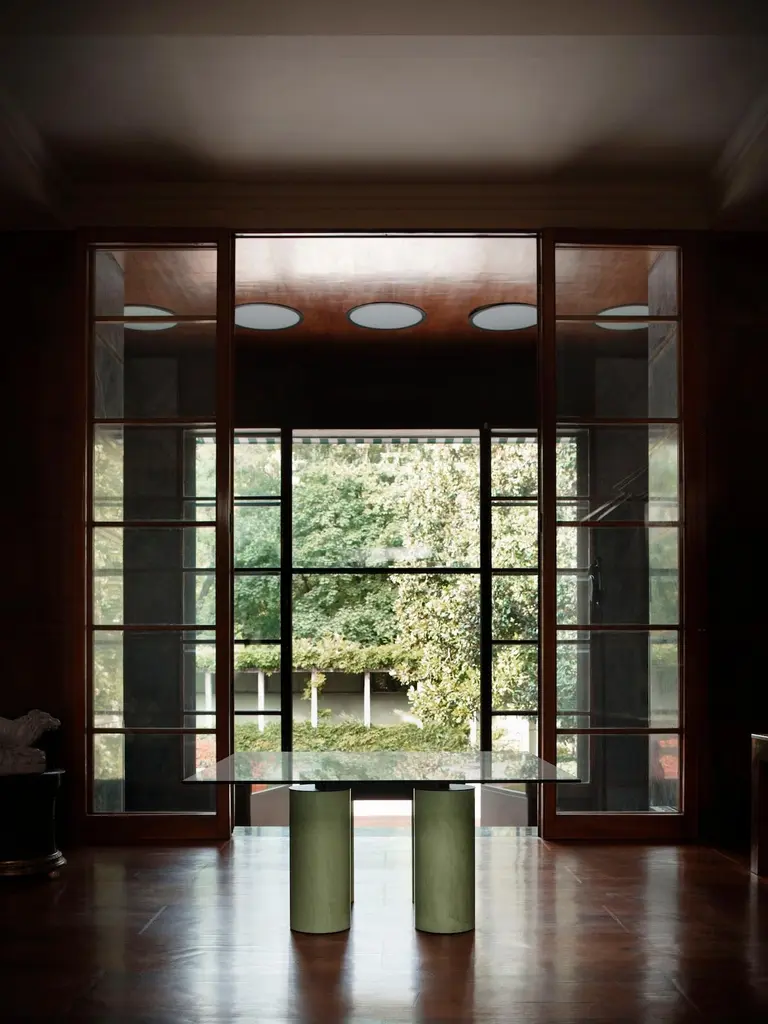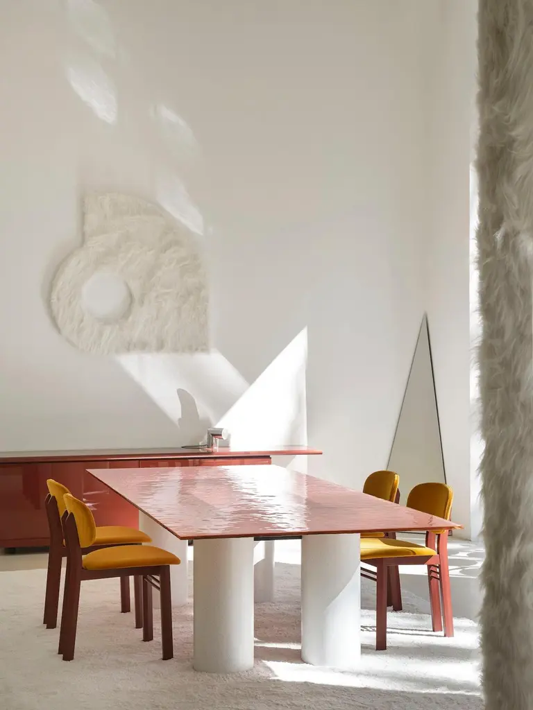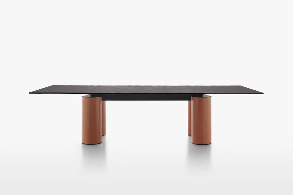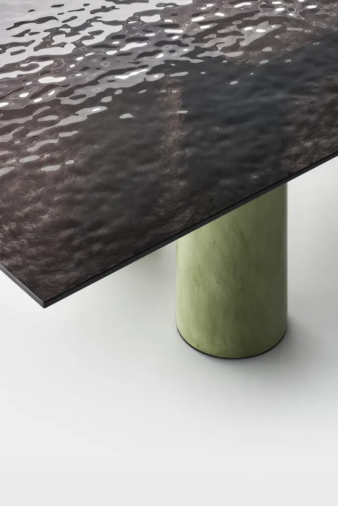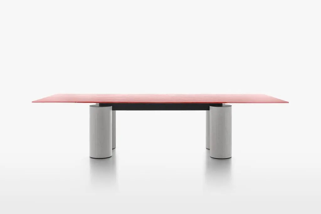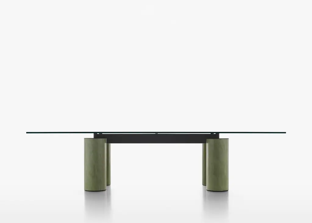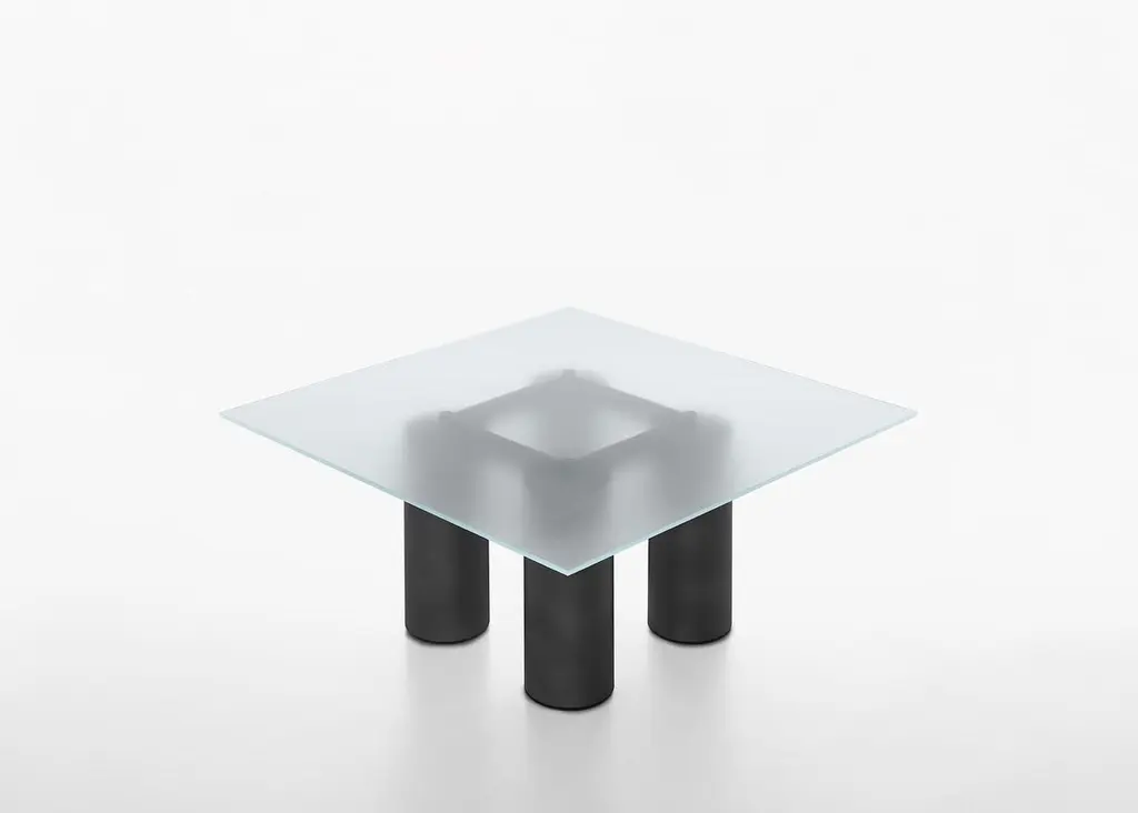 With the precision of its contours, Serenissimo translatesthe concept of the table into a graphic composition with fourcolumns and a horizontal steel bar that makes the table topappear to float. In line with Lella and Massimo Vignelli’s originaldesign, it is an object that expresses itself through its geometryand materials: basic shapes characterised by metallic finishes orsoft encaustic tones.StructureThe structure consists of 4 cylindrical bases (Ø 28 cm) made witha steel tube, painted in either a gun-metal grey or orbital bronzefinish, or, in Encausto’s more tactile variations, in the coloursterracotta, green, and white. The metal frame that holds togetherthe 4 bases and supports the table top is painted micaceousgrey.TopThe tops are available in either a square or rectangular versionand in the following finishes:_ transparent glass, float glass plate characterized bytransparency. Thickness 15 mm;_ extra clear opalescent glass, float glass plate with smoothand glossy upper side, acid-etched lower side.Thickness 15 mm;_ cast glass, glass plate hot molded with smooth and glossyupper side, wrinkled (for casting) and semi-transparentback-lacquered lower side, in the colours black, mustardyellow, English green, pink. Thickness 15 mm;_ lacquered frosted white glass, float glass plate withacid-etched upper side (silky effect to the touch), andback-lacquered lower side. Thickness 15 mm.Encausto: also known as “Venetian stucco”, encausto usesa highly sophisticated technique in which a fine sand plasteris applied in successive layers, the last of which is colouredwith natural earth. In this stage a fluidmalleable mixture oflimewash is used to burn the colour, changing it as it dries (infact, “encausto” is a Latin term that derives from the Greek word“enkaustikos” or “to burn in”). In the “tallocciatura” phase, whichrefers to the process of manually smoothing the plaster throughthe skilful use of a spatula, the coloured mixture is unevenlyincorporated in the plaster, giving the surface the characteristicappearance of this ancient artisan tradition.SizeRectangular: L250xD120 - L300xD120 - L350xD120.Square: L160xD160 - L180xD180 - L200xD200.H72 cm.