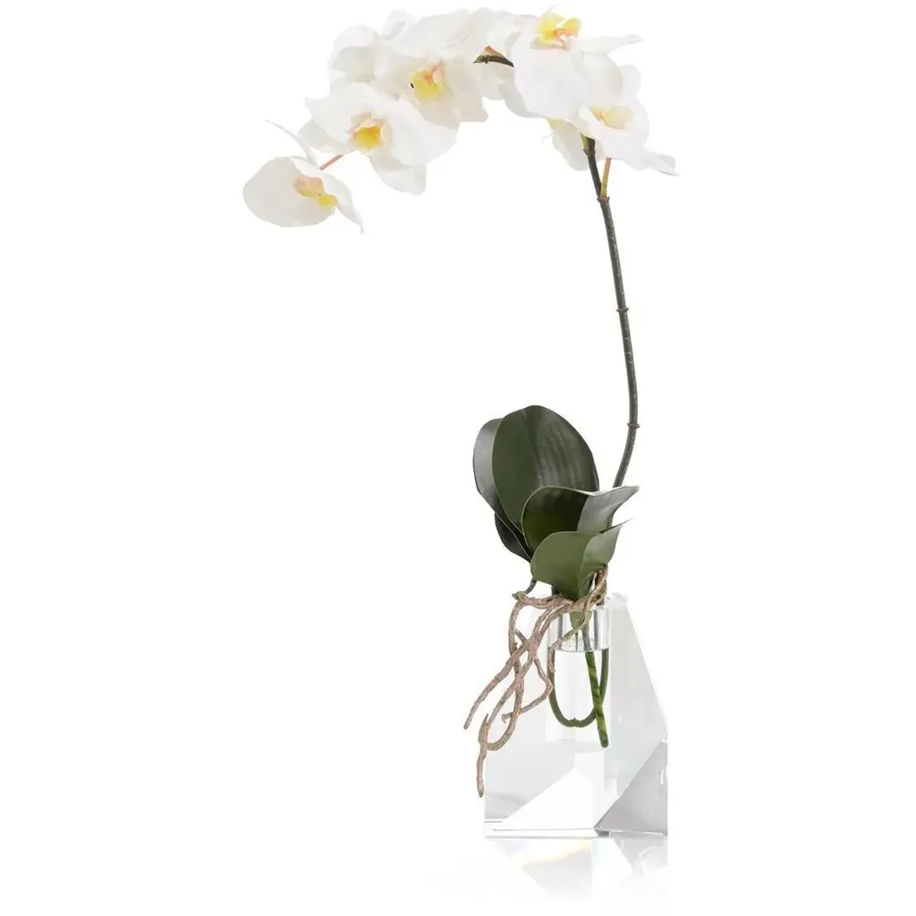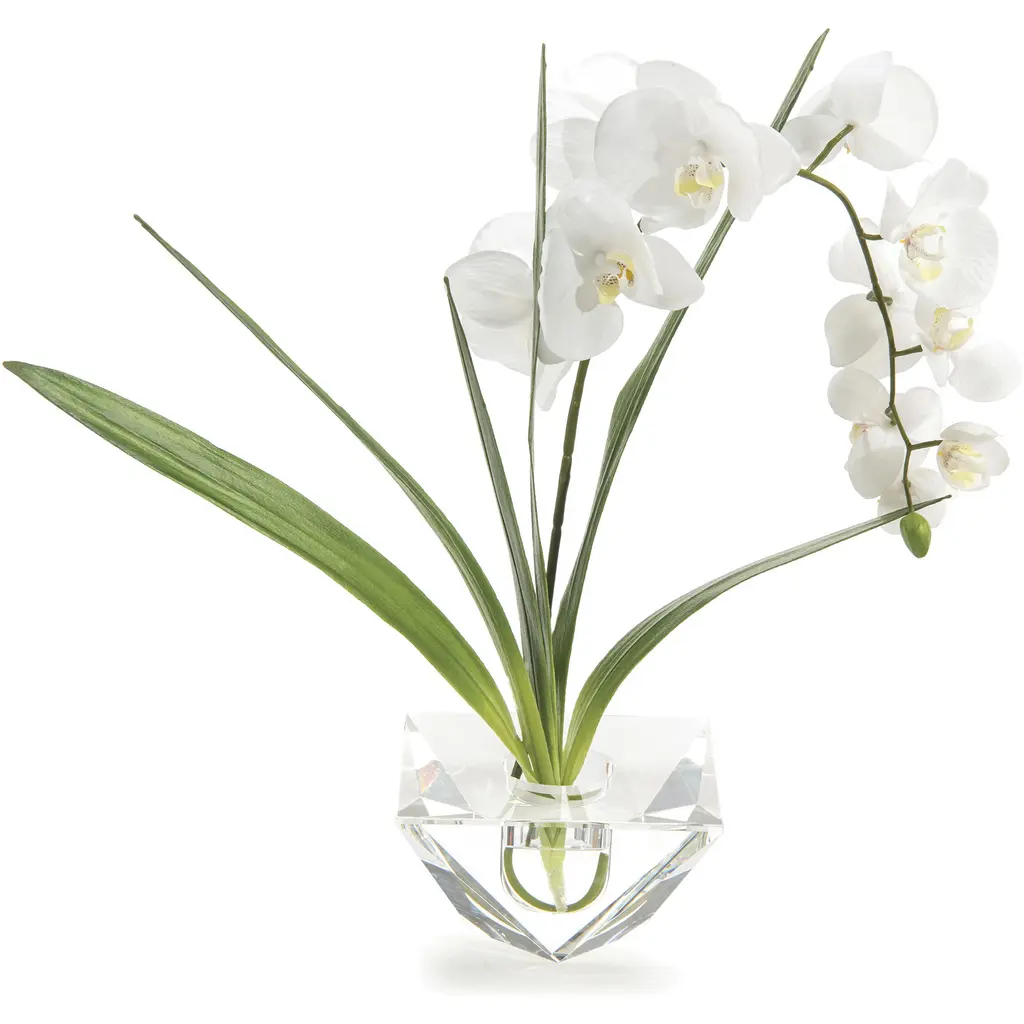 20"H X 25"W X 10"D A diamond-cut crystal vase holding a white phalaenopsis orchid and foliage in faux water.