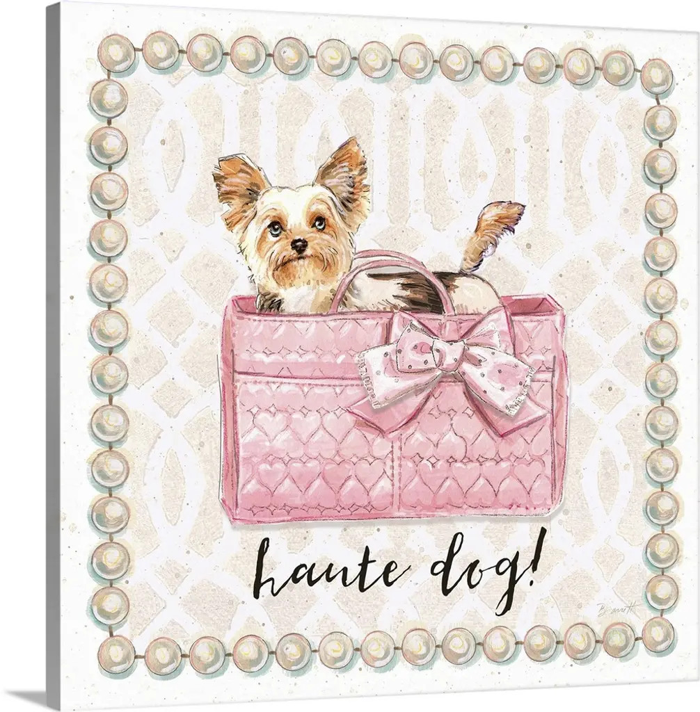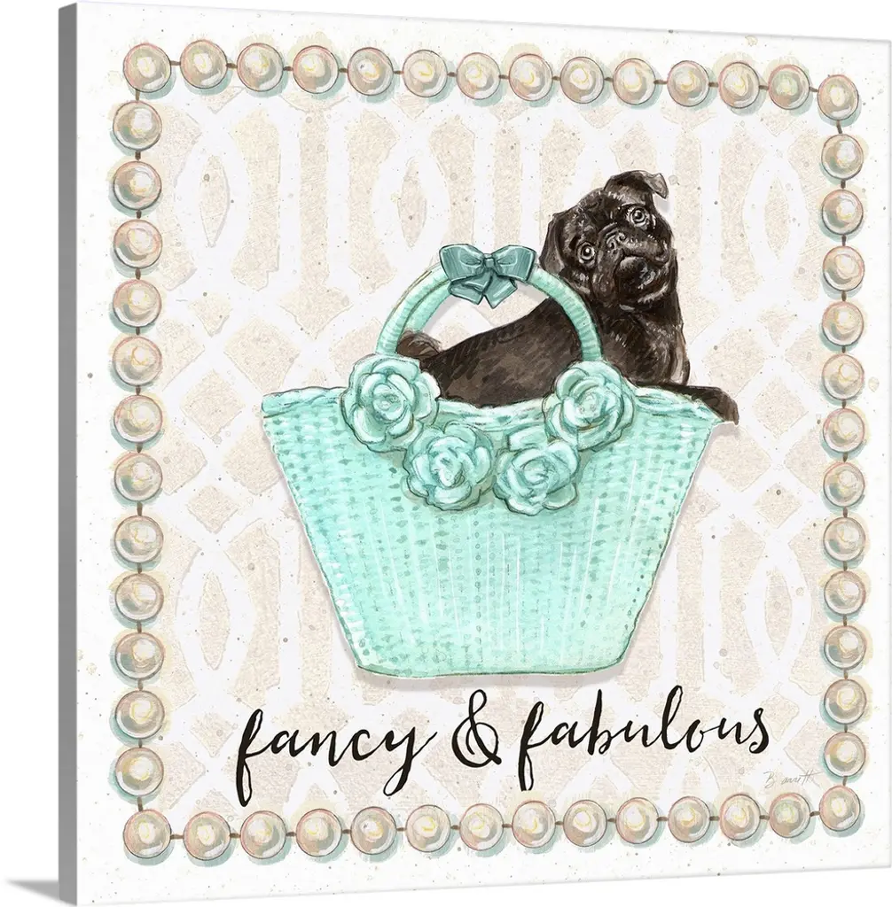 Illustration of a cute pug puppy in a fashionable handbag.