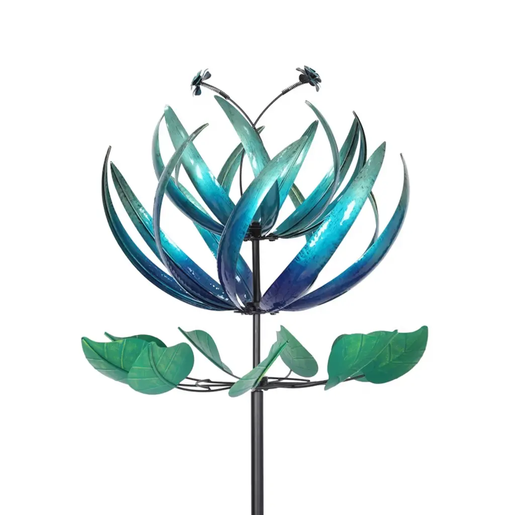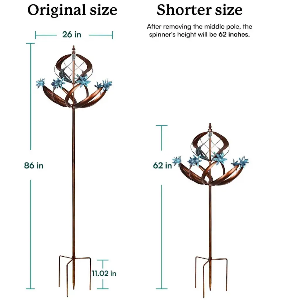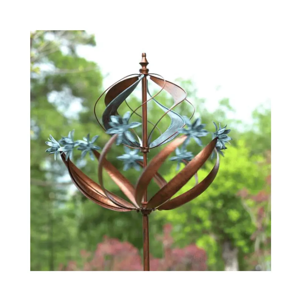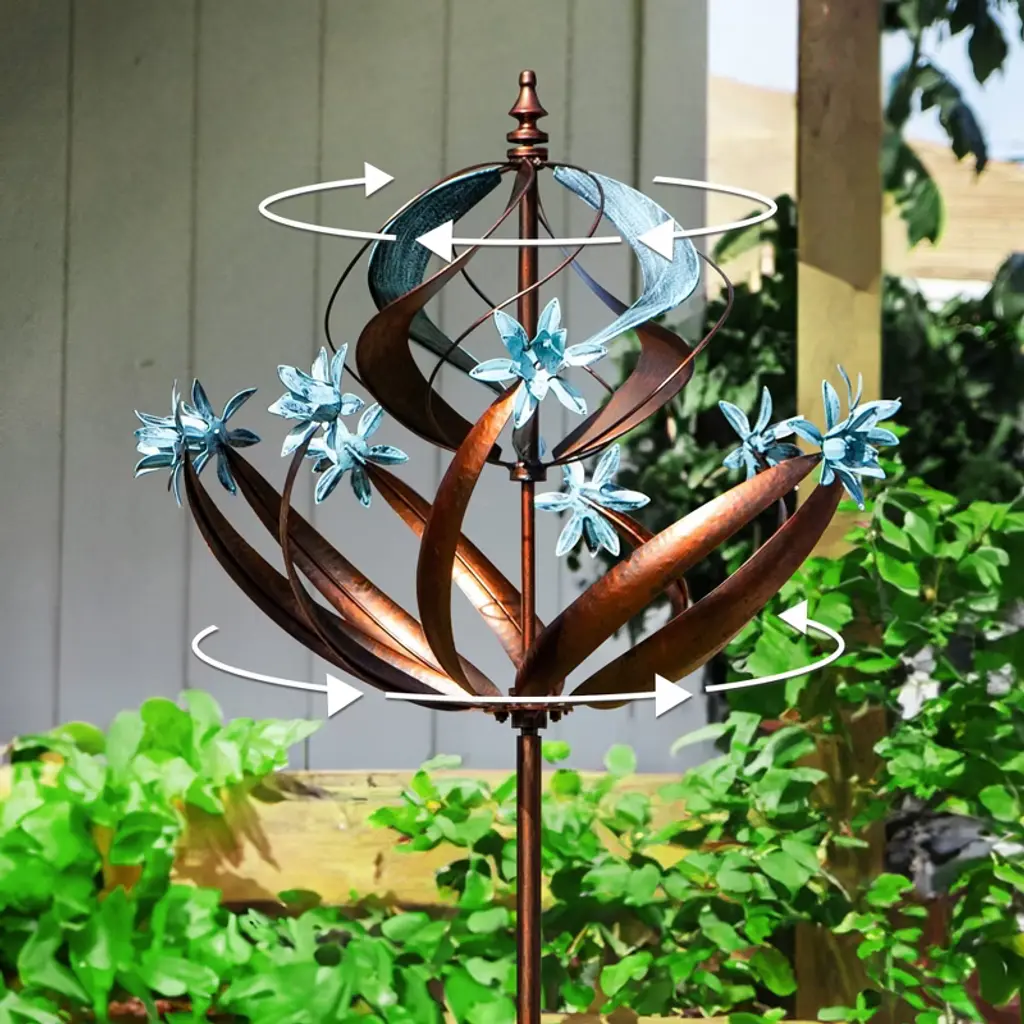The Globe Flower Wind Spinner is a charming garden ornament featuring a globe-shaped flower design that spins gracefully in the breeze, small blue flowers fall lightly on vintage petalsadding a touch of whimsical beauty and kinetic art to outdoor spaces.