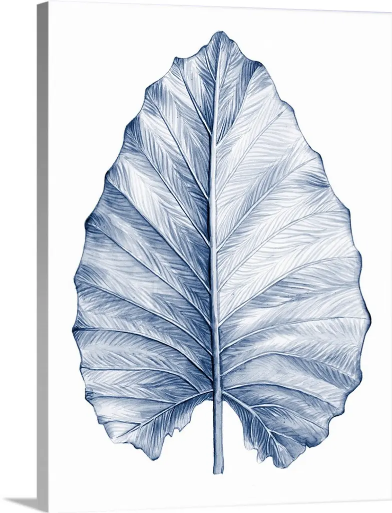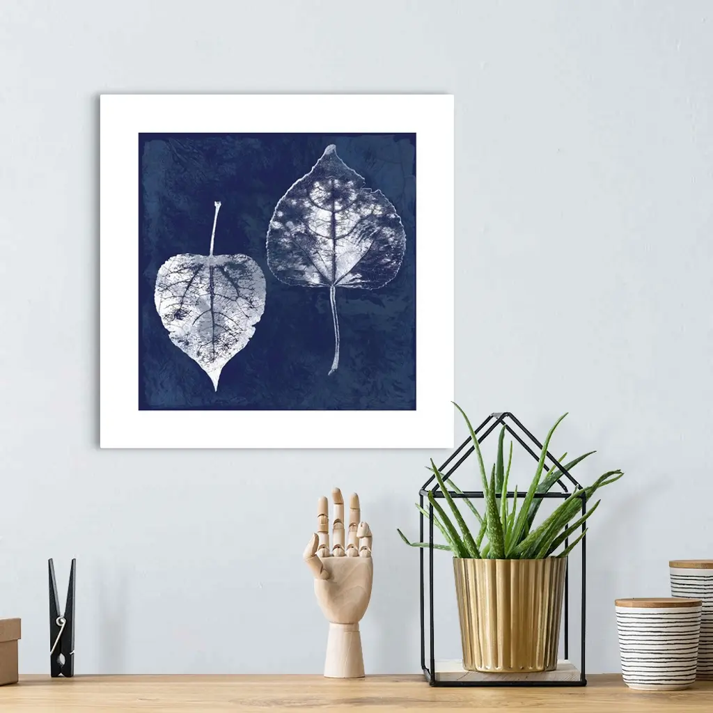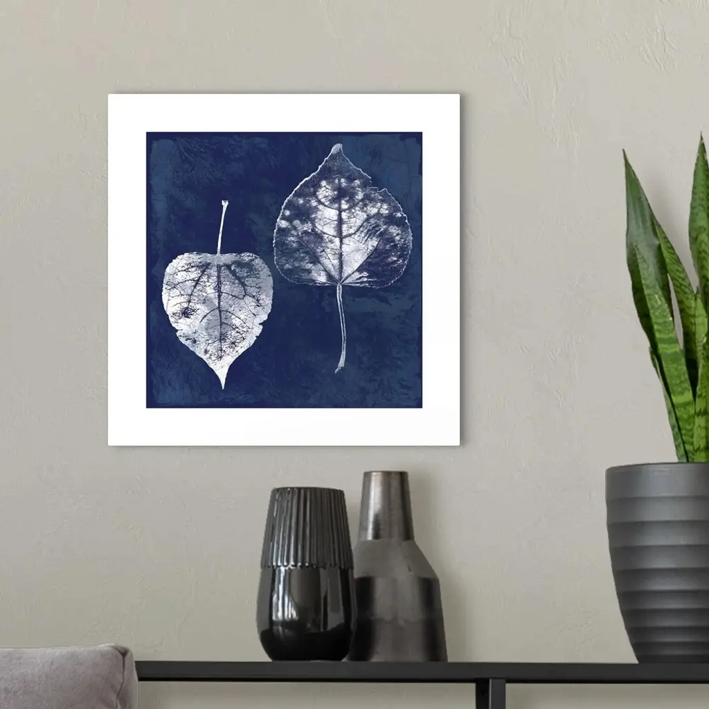 Square cyanotype of white silhouetted leaves on an indigo background with a white boarder.