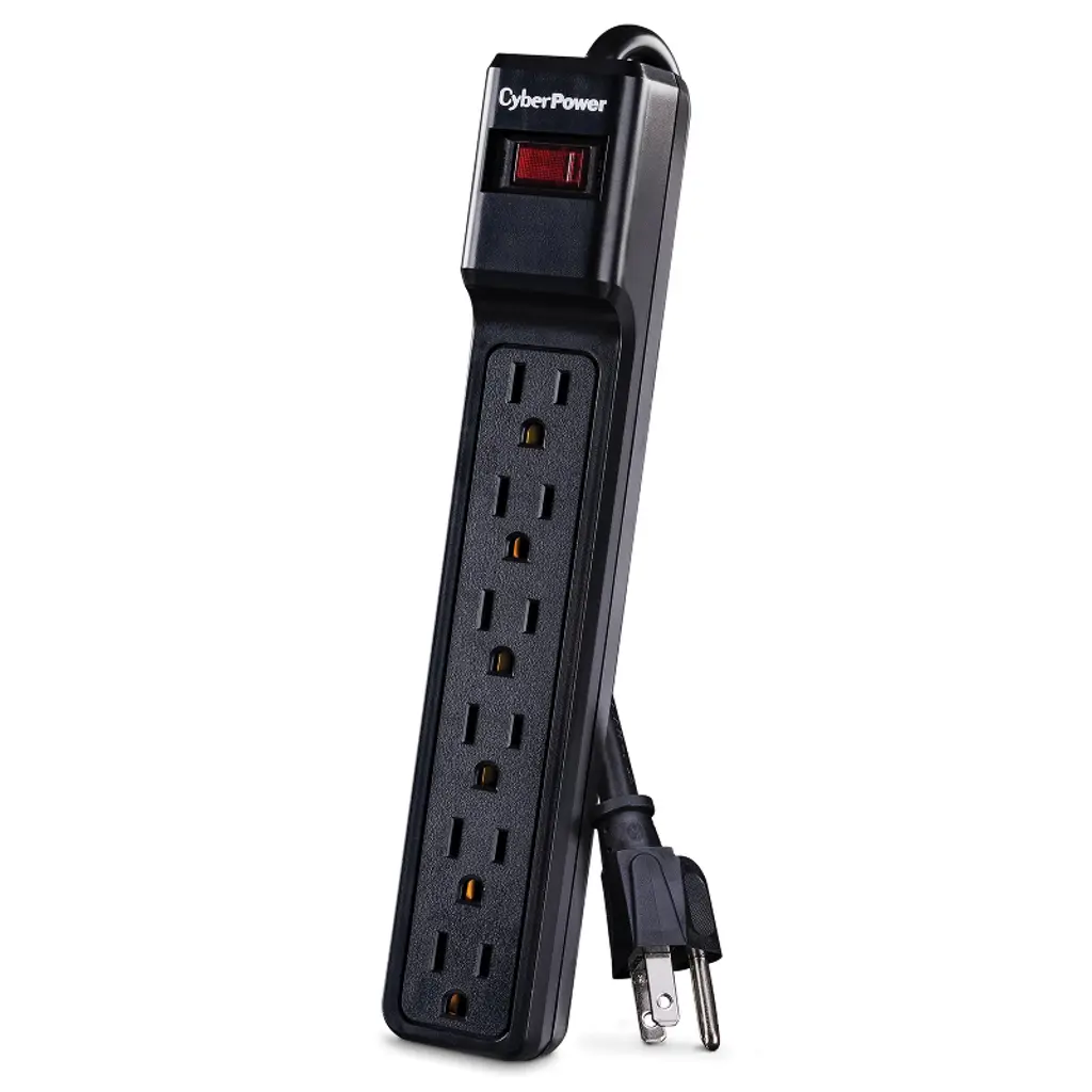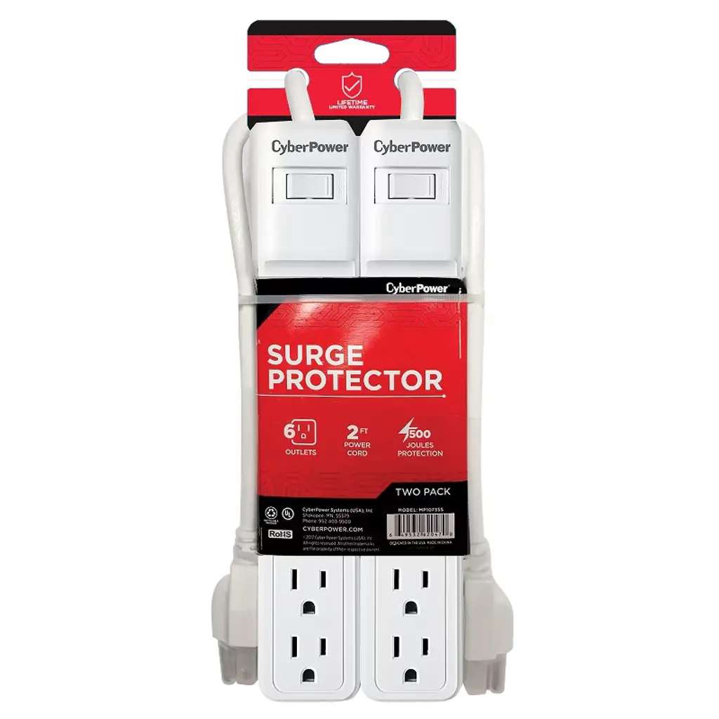 The CyberPower MP1073SS Essential Surge Protector 2 Pack offers vital surge protection for common home and office devices such as computers and electronics. Each 6 outlet strip prevents spikes in energy caused by storms and electrical power surges from reaching your electronic equipment. The MP1073SS provides 500 Joules of protection and a 2 ft. power cord per strip. Each surge suppressor comes with a limited lifetime warranty and a Connected Equipment Guarantee.