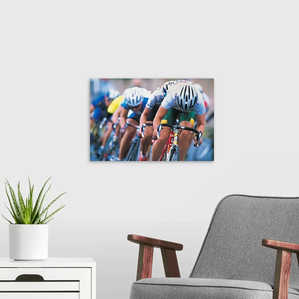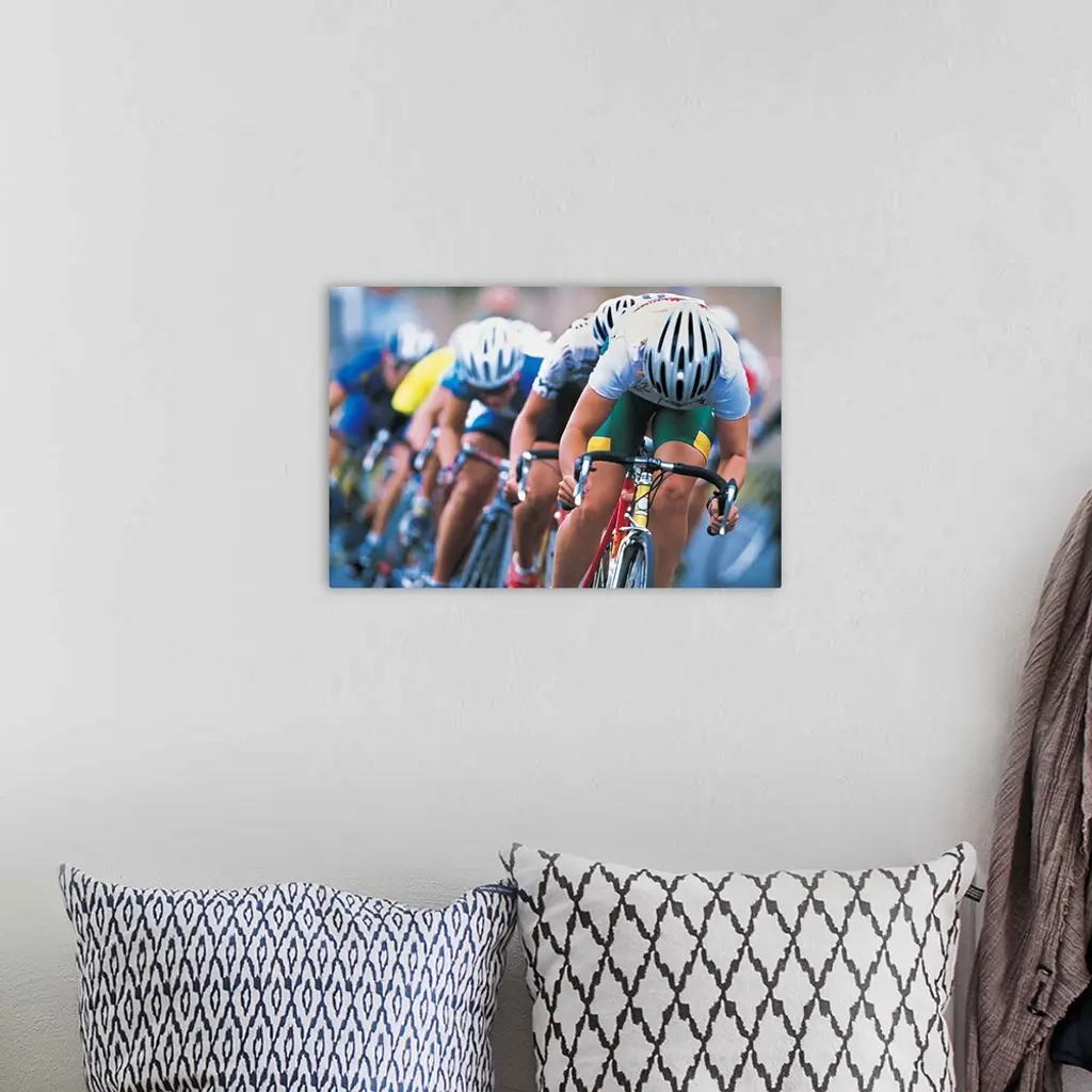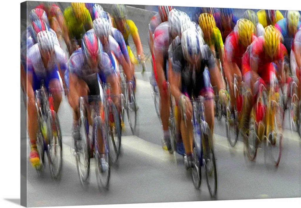 Photograph of a several racers in a bicycle race hurrying towards the finish line, with their heads down, pedaling hard.