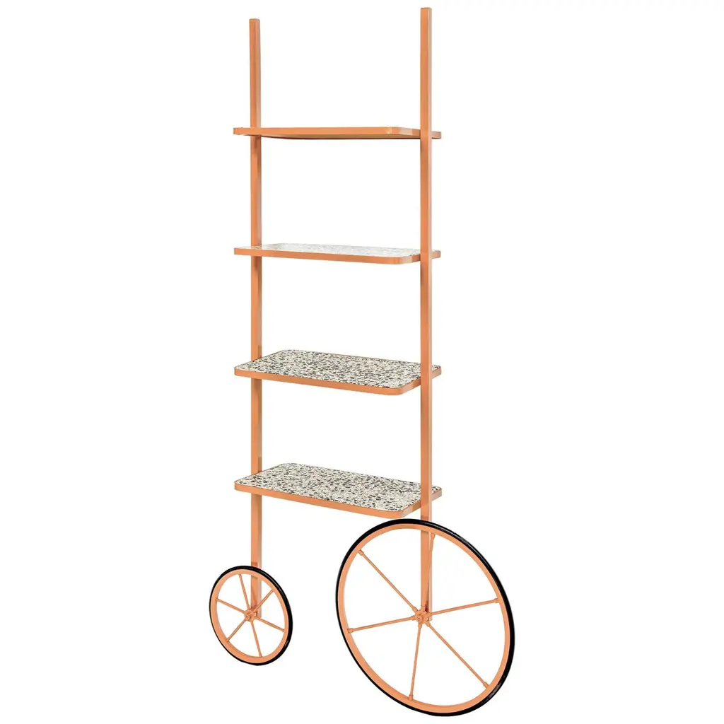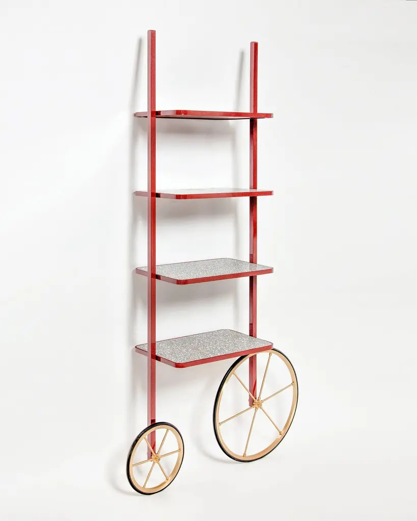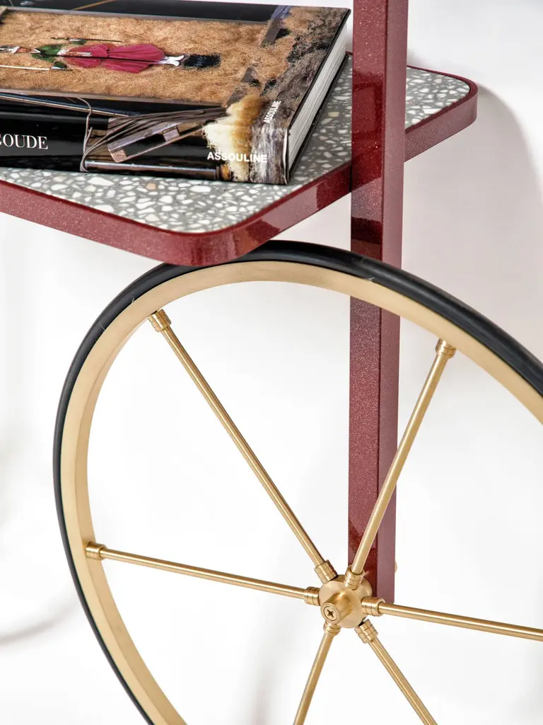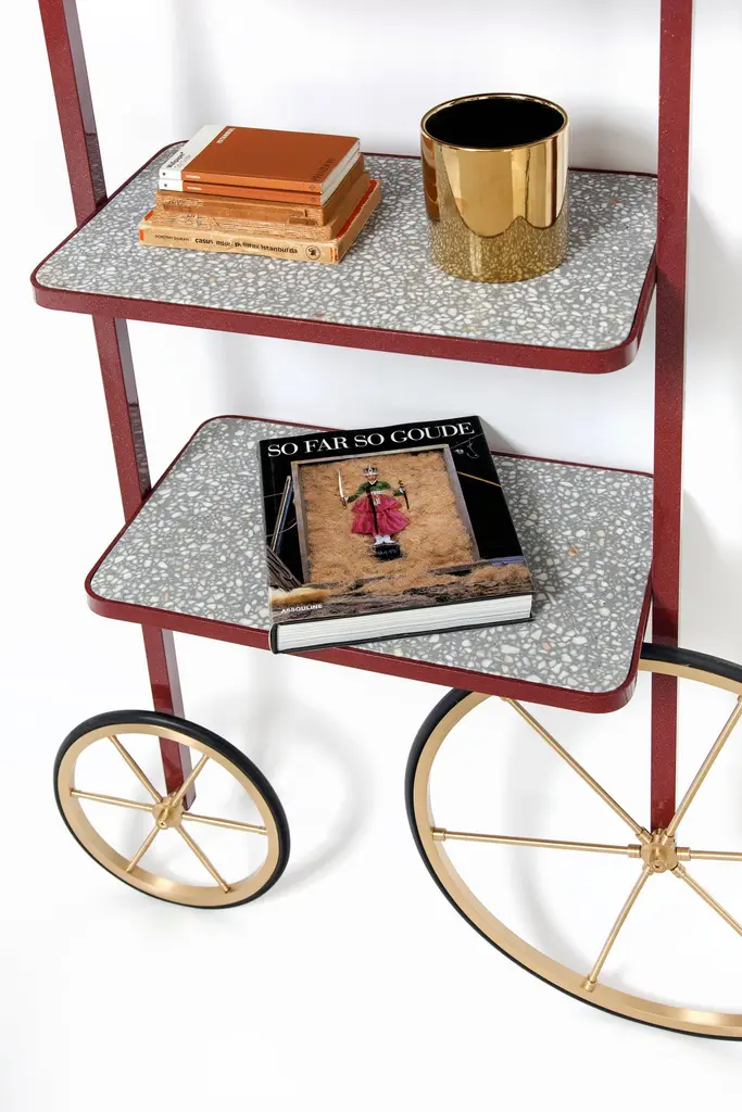 The design for Cyclopedia stems from the high wheel bicycles of the 1870s. Unlike most bookshelves, Cyclopedia differentiates itself through its portable structure. This unique piece is a library and a display shelf that can be wheeled and positioned in various locations around the space to meet the owners preference and purpose. This new edition of Cyclopedia is composed of Bordeaux color powder coated metal and grey terrazzo, this hand crafted piece is sure to bring an eclectic vibe to any surface it leans against.