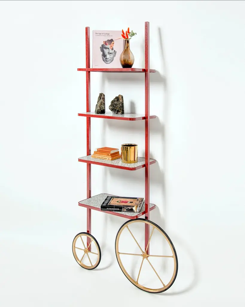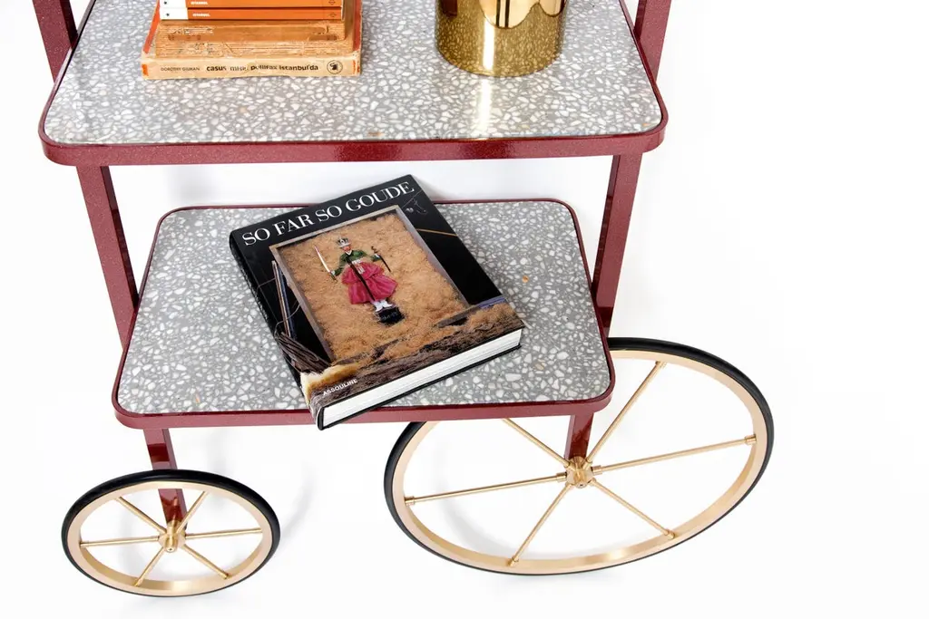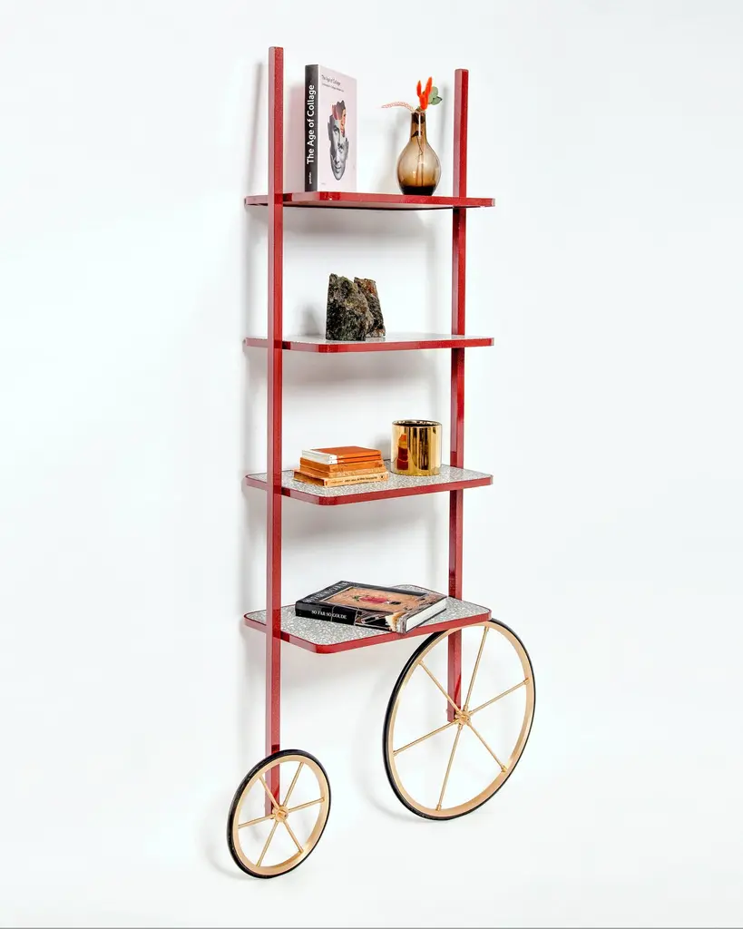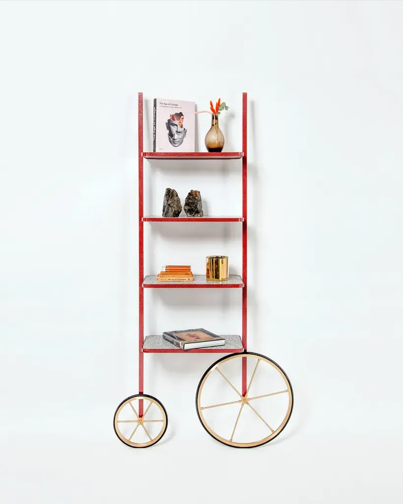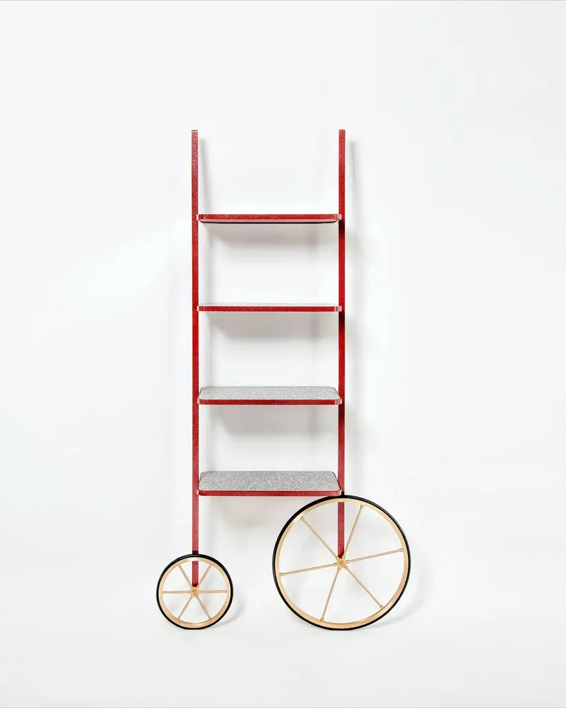 The design for Cyclopedia stems from the high wheel bicycles of the 1870s. Unlike most bookshelves, Cyclopedia differentiates itself through its portable structure. This unique piece is a library and a display shelf that can be wheeled and positioned in various locations around the space to meet the owners preference and purpose. This new edition of Cyclopedia is composed of Bordeaux color powder coated metal and grey terrazzo, this hand crafted piece is sure to bring an eclectic vibe to any surface it leans against.