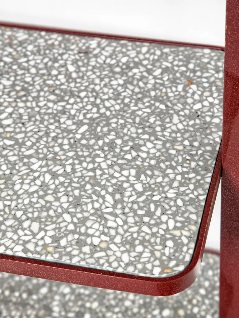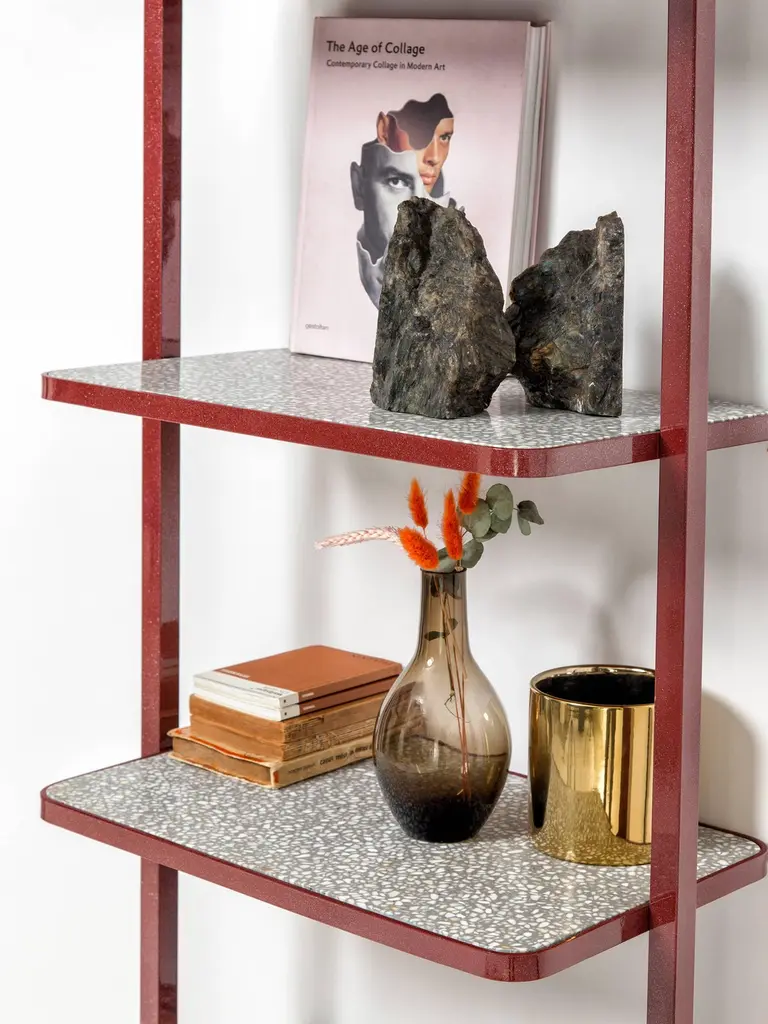 Cyclopedia Bookshelf In Bordeaux Powder Coated Metal And Gray Terrazzo