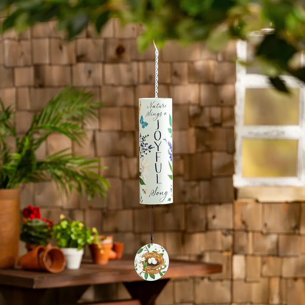 Enjoy the relaxing sounds of chimes as a gentle breeze passes through this Wind Chime. This wind chime is a great way to add a serene finish and soothing sounds to any outdoor space. It features a beautiful floral design with a sweet “Let the Sun Shine” message. Easily hang this artful decoration in the garden or on the patio or porch. Made of sturdy, weatherproof metal to withstand the elements and bring joy for seasons to come. For the longest life, we recommend bringing it indoors during harsh or extreme conditions.