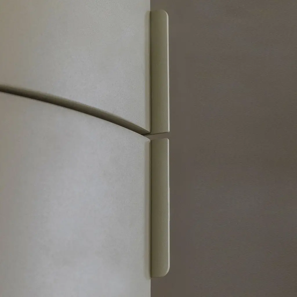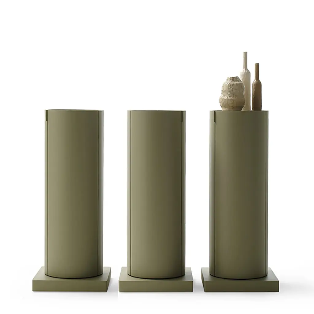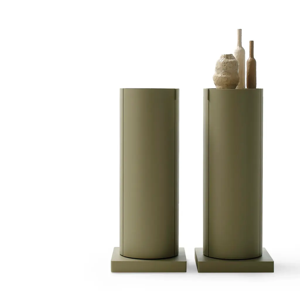 Experience luxury and functionality with LA DORI cylindrical column storage. Made from curved plywood, choose from a variety of matte or glossy lacquered colors and base options. Includes 2 glass shelves and customizable door opening. Pair with a honeycomb plinth or black metal base for a sophisticated touch.