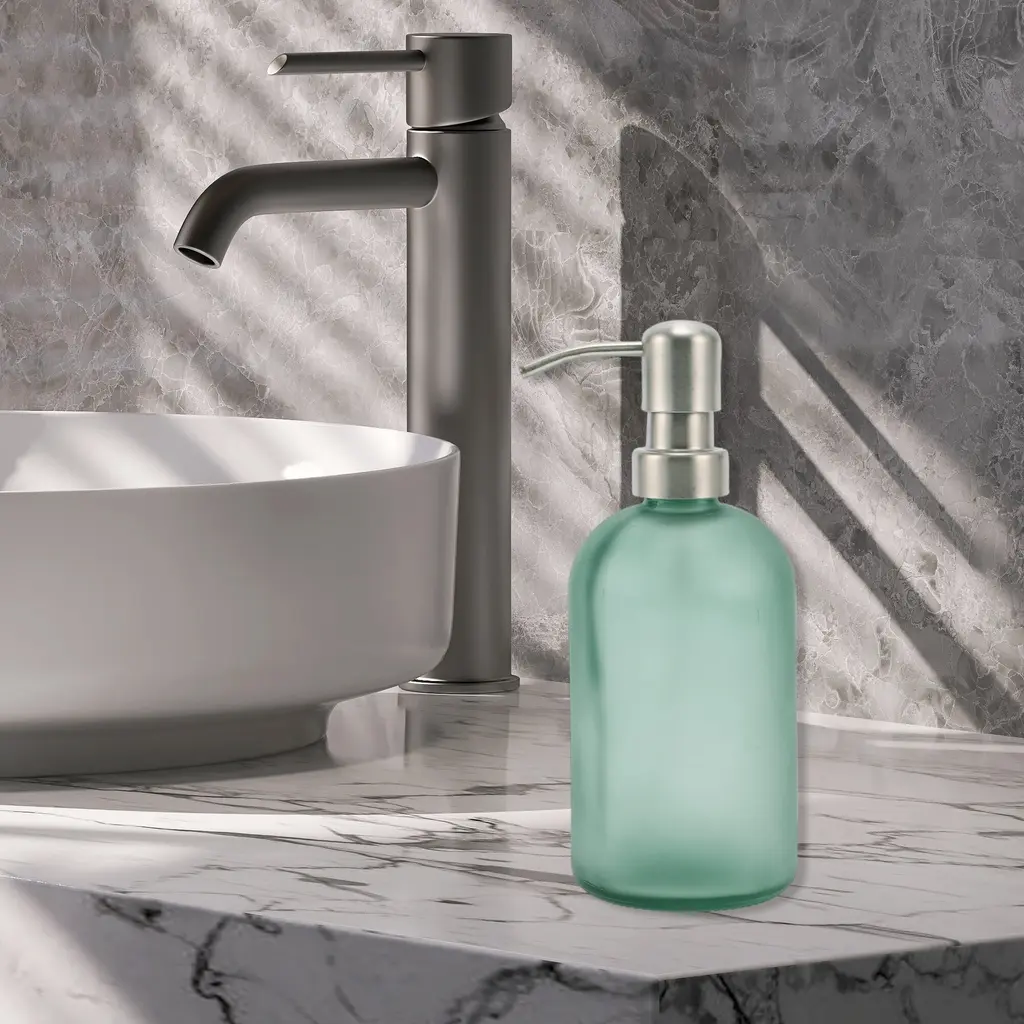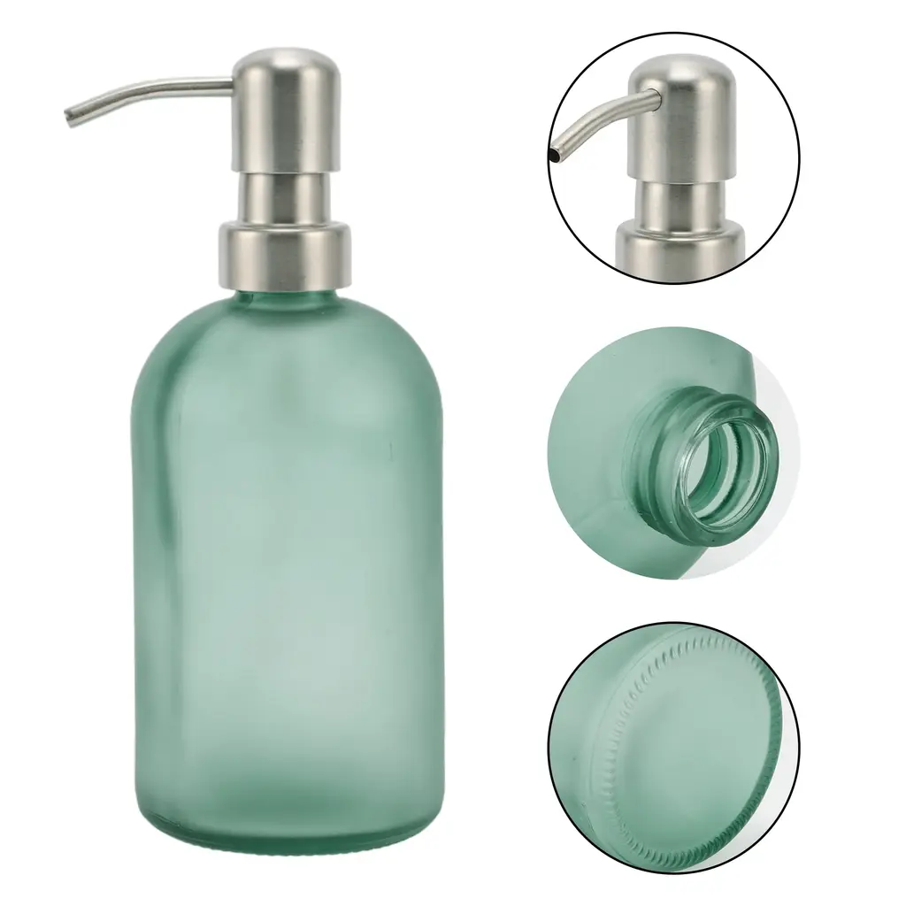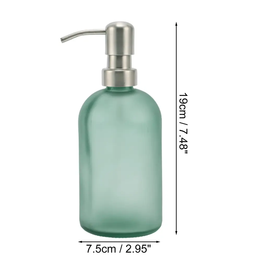 Feature:Liquid soap dispensers are a more stylish home decor for kitchen and bathroom countertops.Stylish and modern design, simple yet elegant, adding a touch of sophistication to everyday essentialsEasy to pump, falls well on hands when pressed and does not spray on clothes.Specification:Color: Lake Blue, Silver ToneMaterial: GlassSize: 7.5x19cm / 2.95"x7.48"(D*H)Package Included:1 Pc Soap Pump Dispenser
