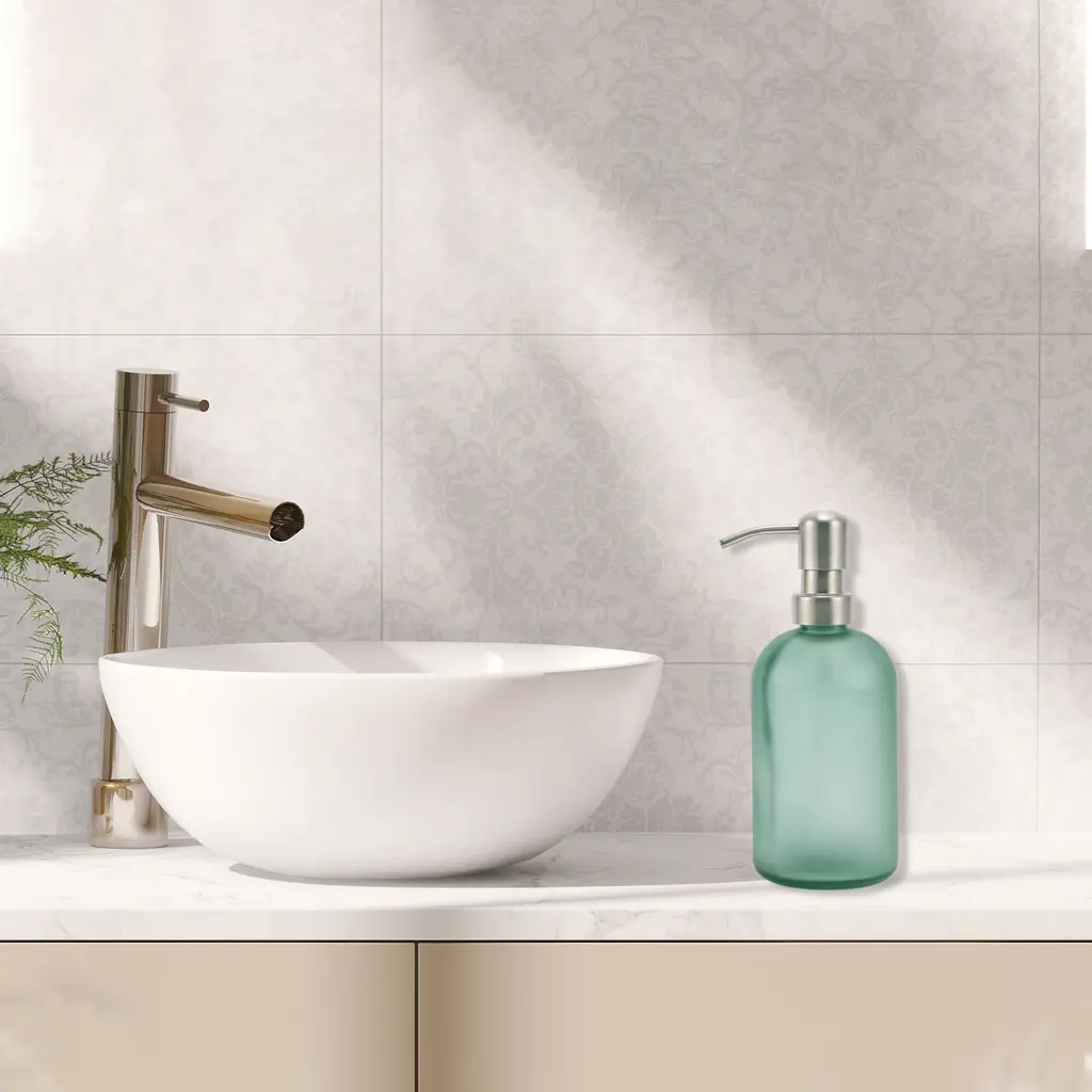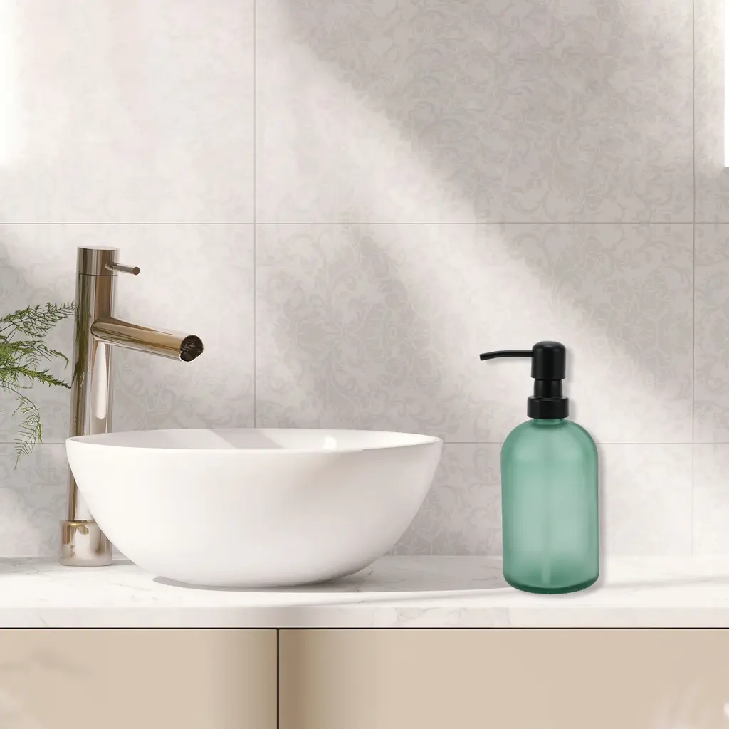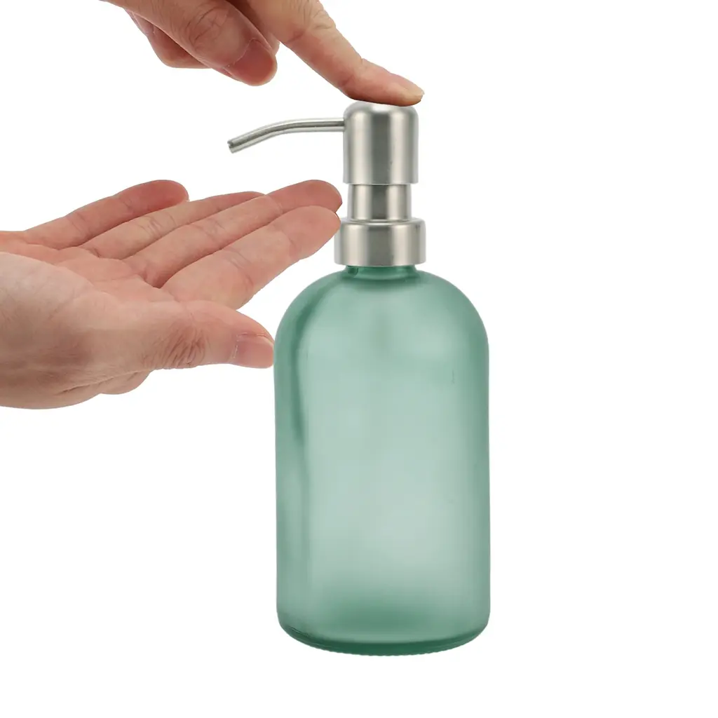 Feature:Liquid soap dispensers are a more stylish home decor for kitchen and bathroom countertops.Stylish and modern design, simple yet elegant, adding a touch of sophistication to everyday essentialsEasy to pump, falls well on hands when pressed and does not spray on clothes.Specification:Color: Lake Blue, Silver ToneMaterial: GlassSize: 7.5x19cm / 2.95"x7.48"(D*H)Package Included:1 Pc Soap Pump Dispenser